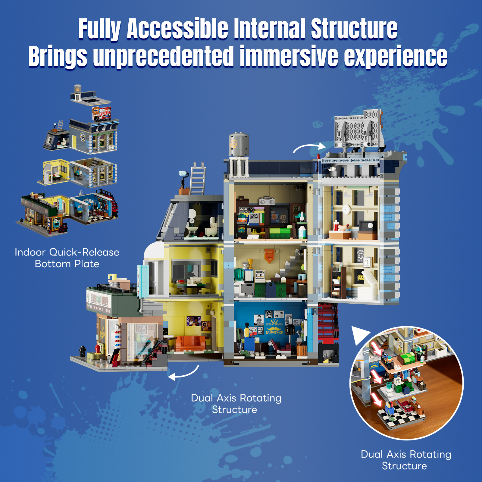 【Dual-Axis Rotating Design】An innovative dual-axis rotating structure allows the storefront and main building to open and rotate separately, with detachable floors for easy viewing and play from every angle.