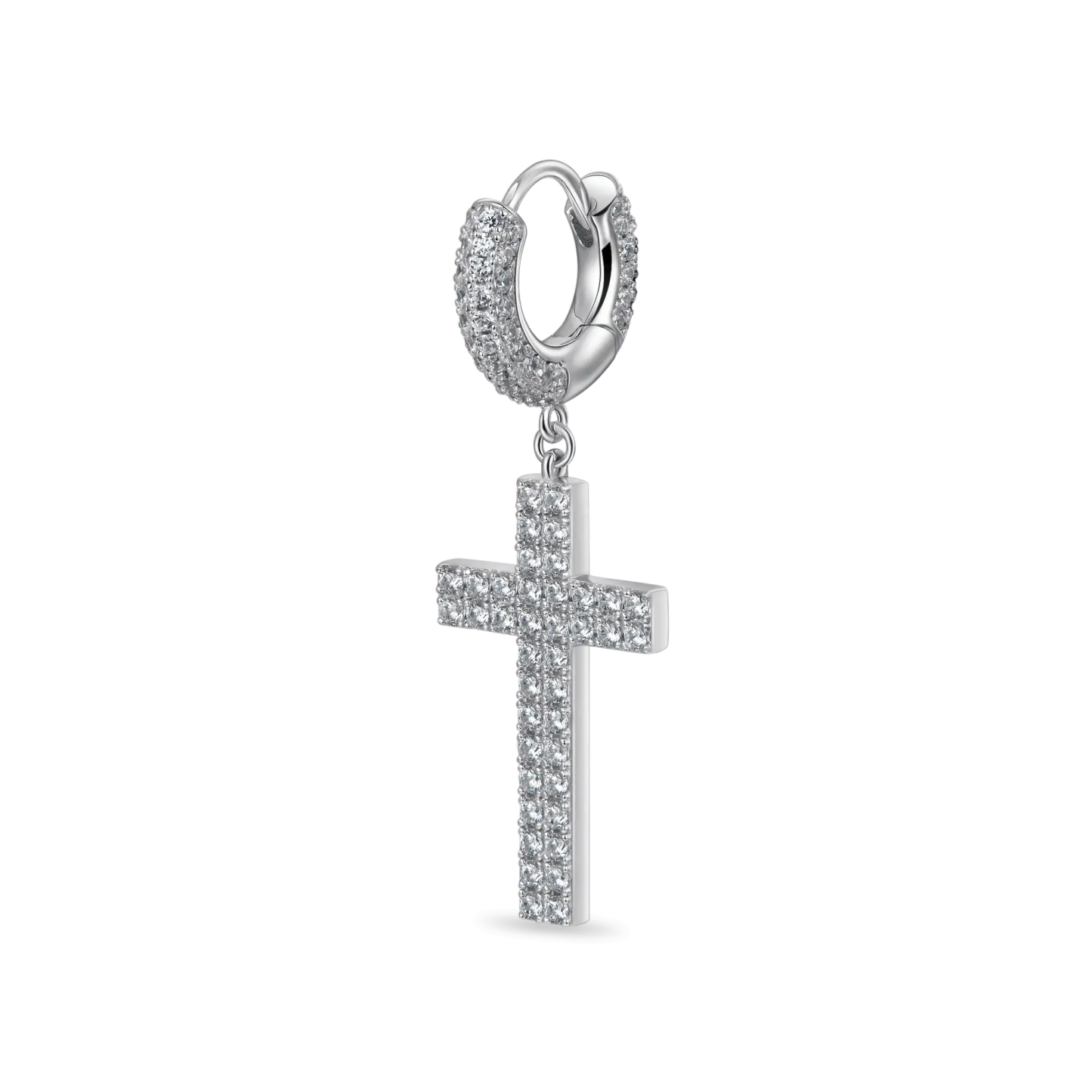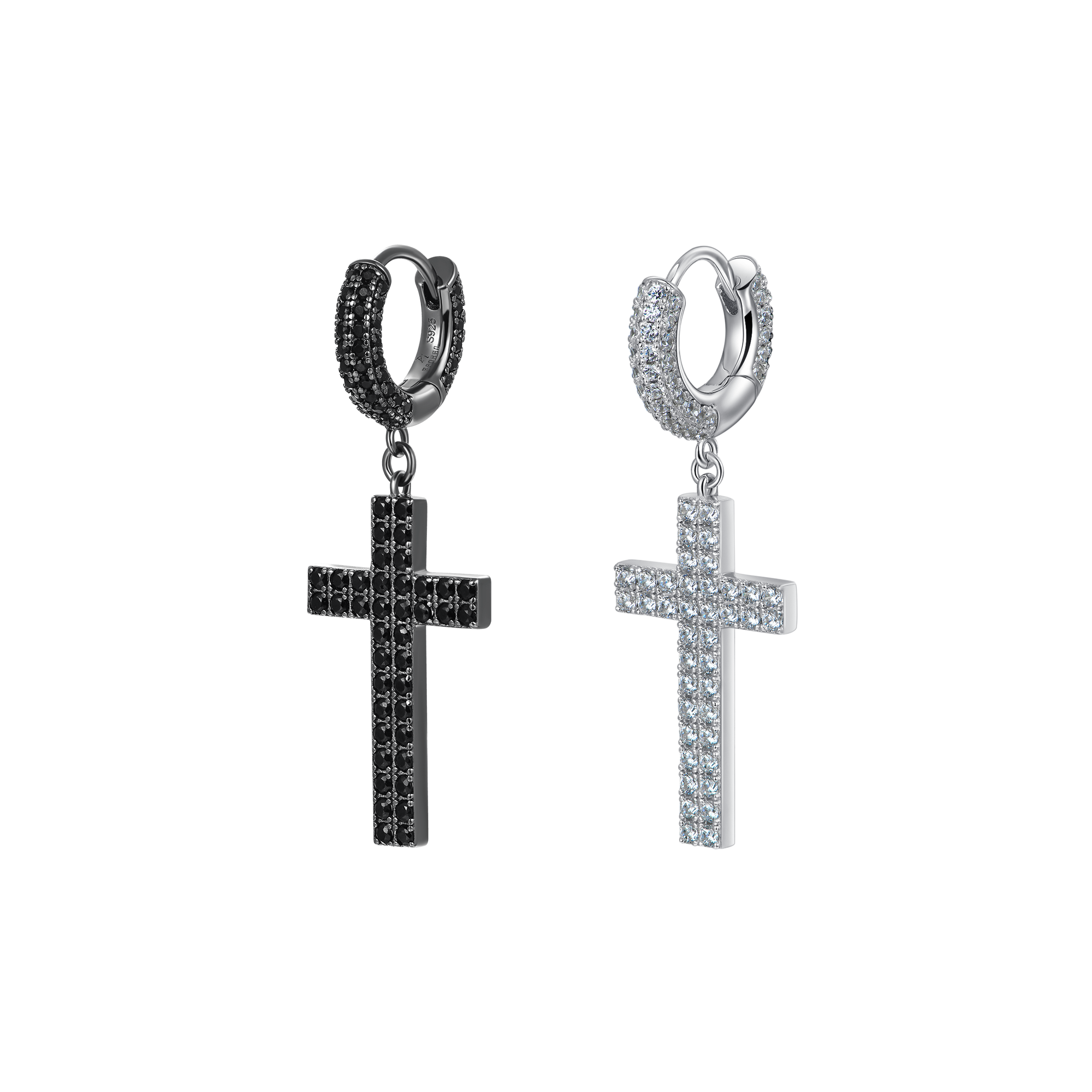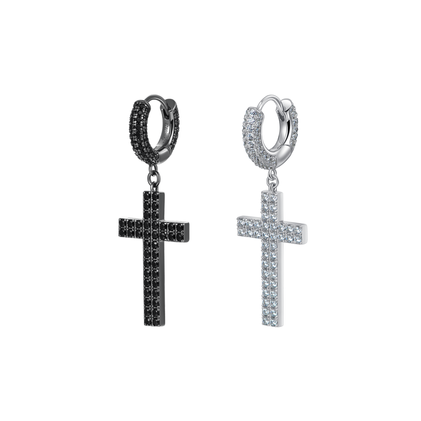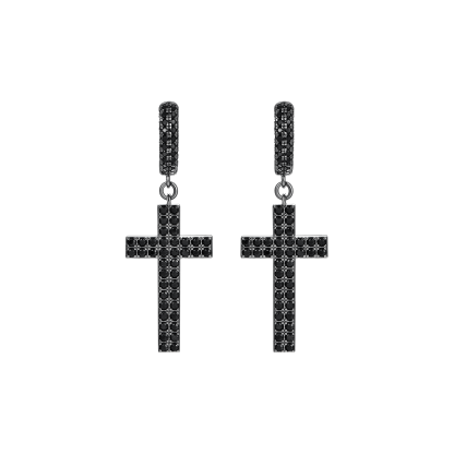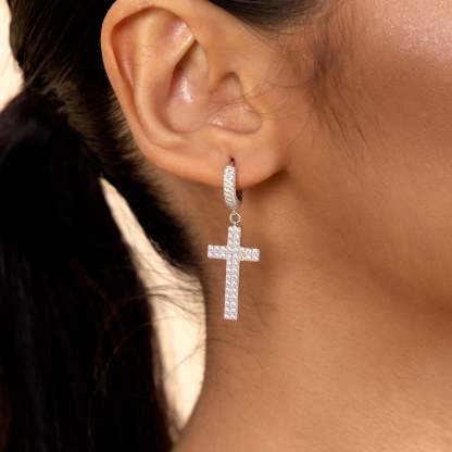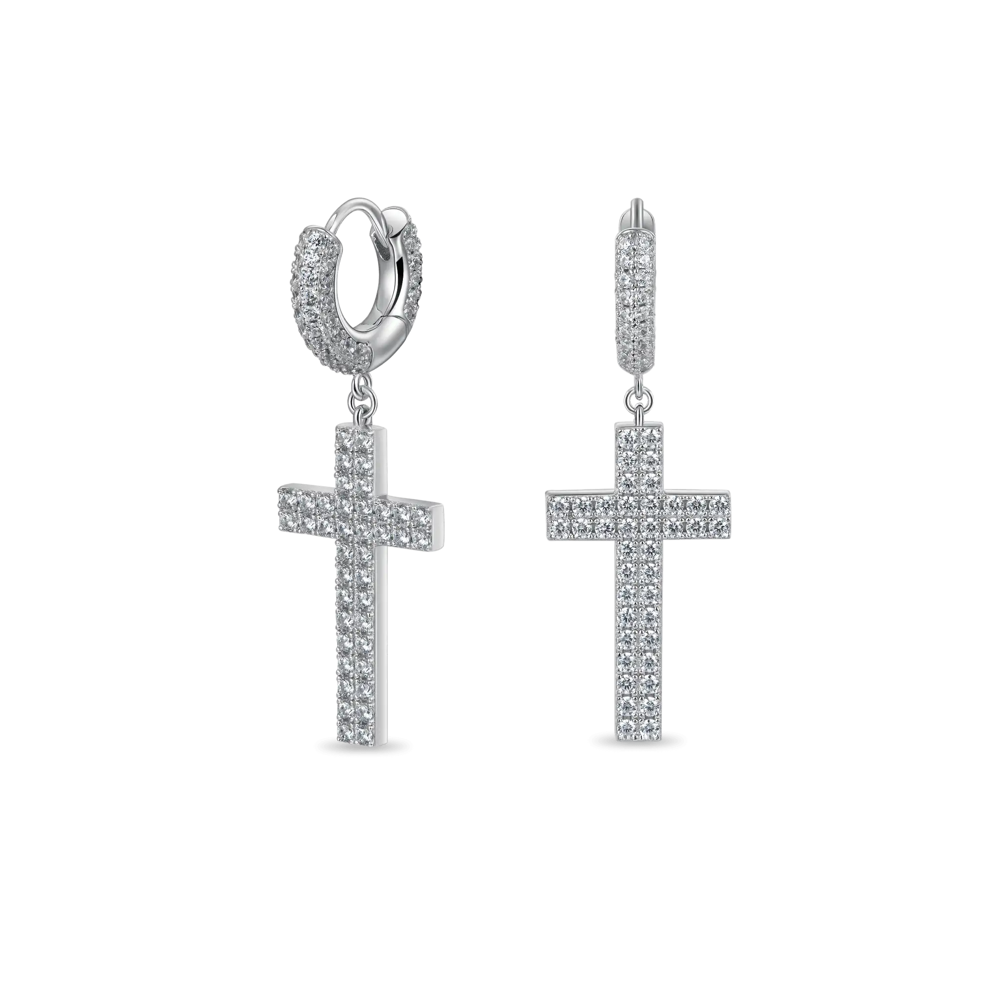 How can you miss the trending fashion of cross-element this summer? The brand new Cross Earrings in 925 Sterling Silver (with Two-Row Gems) are here for you! Made with tension setting, the cross hoop earrings were traced with two rows of round cut CZ stones, which maximizes light return from the top of the stone and adds more sparkles to it. Wrapping snuggly around your earlobes, these chic hoop earrings are comfortable for your everyday wear.