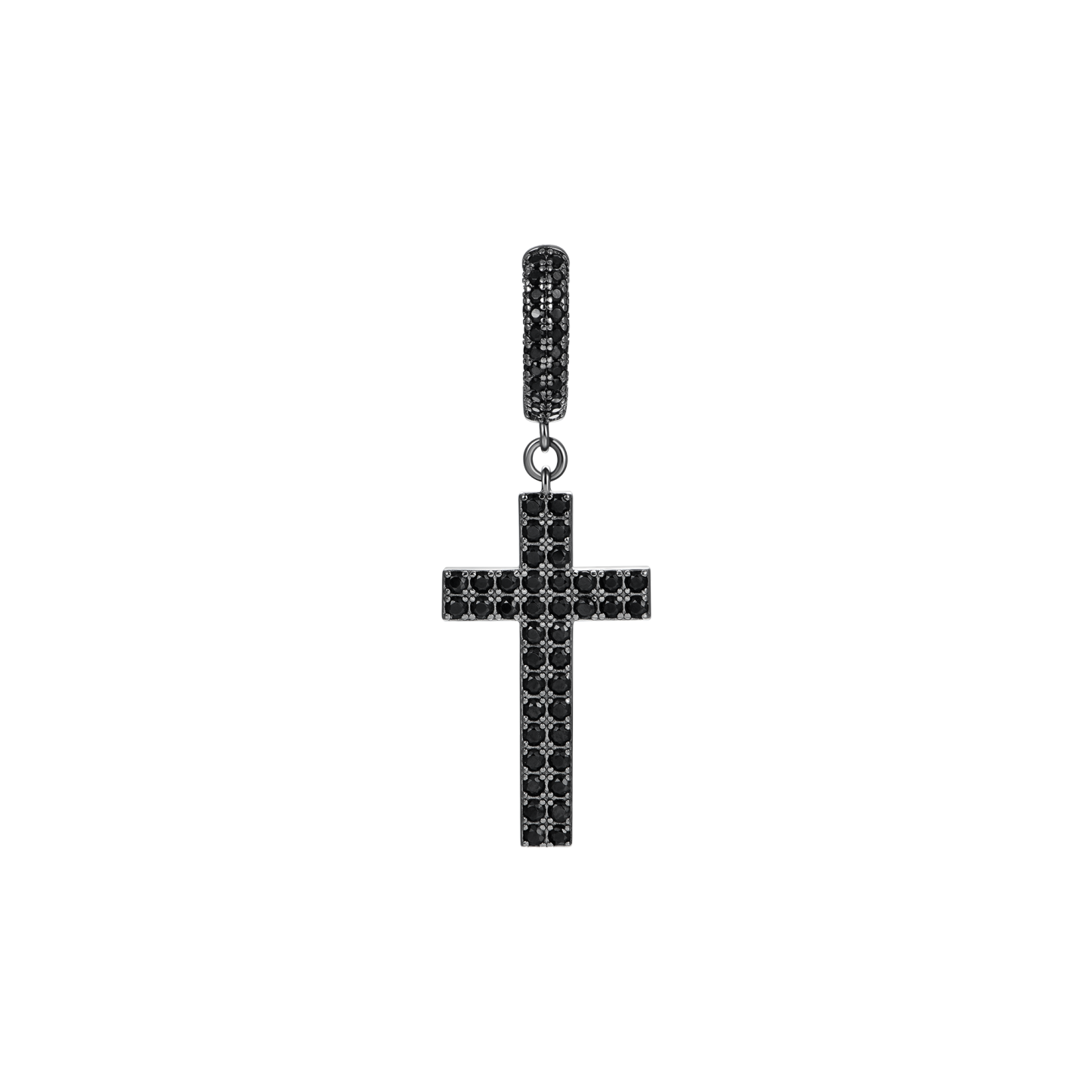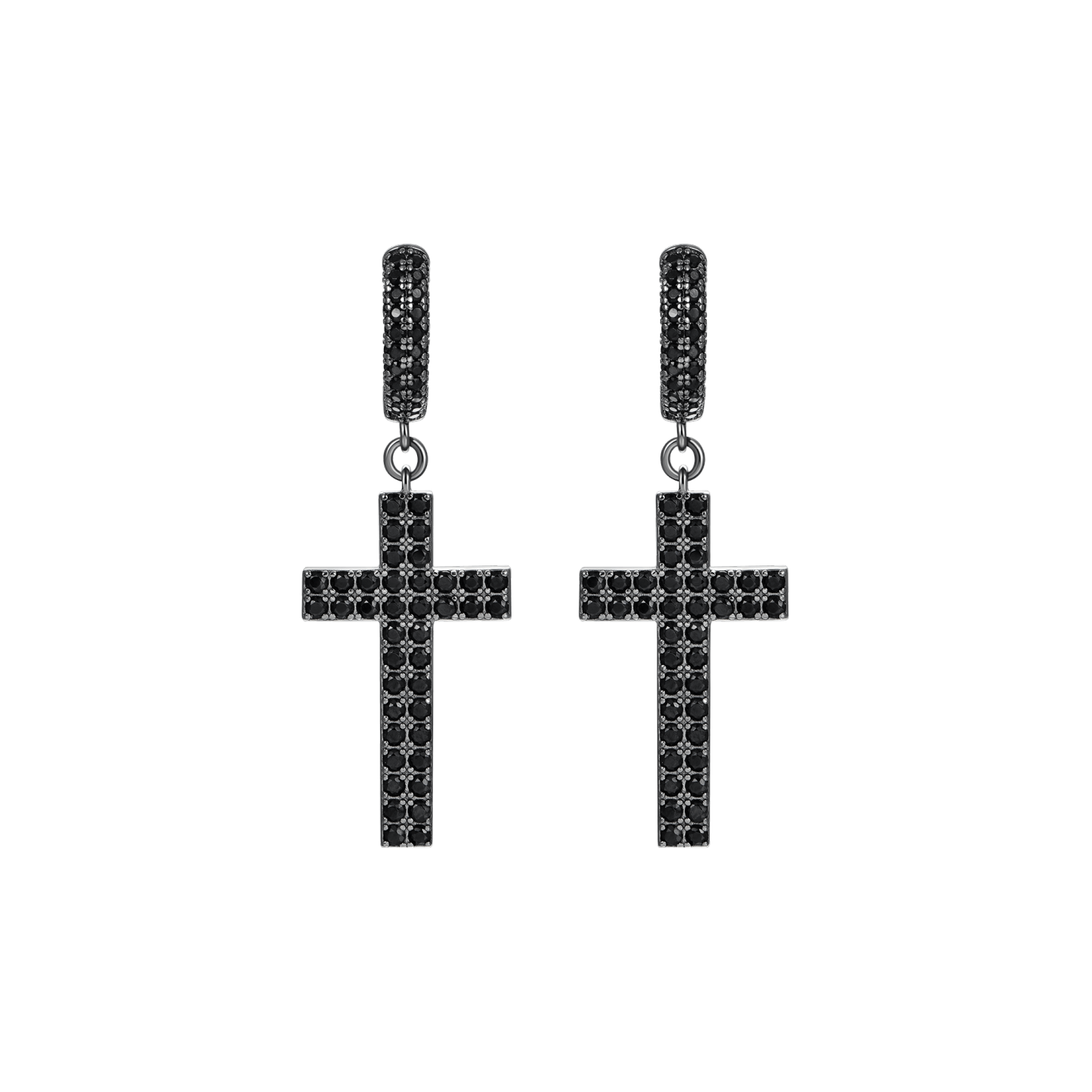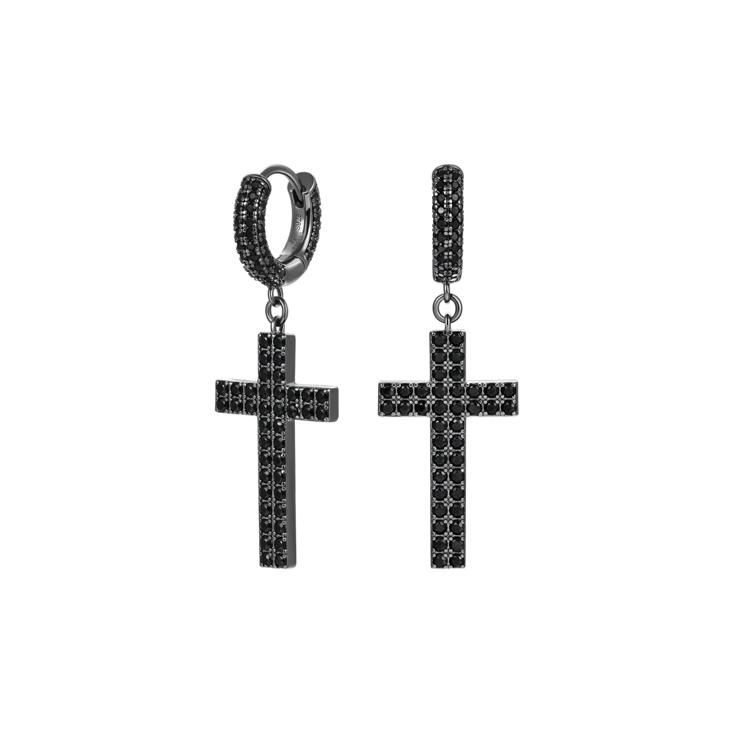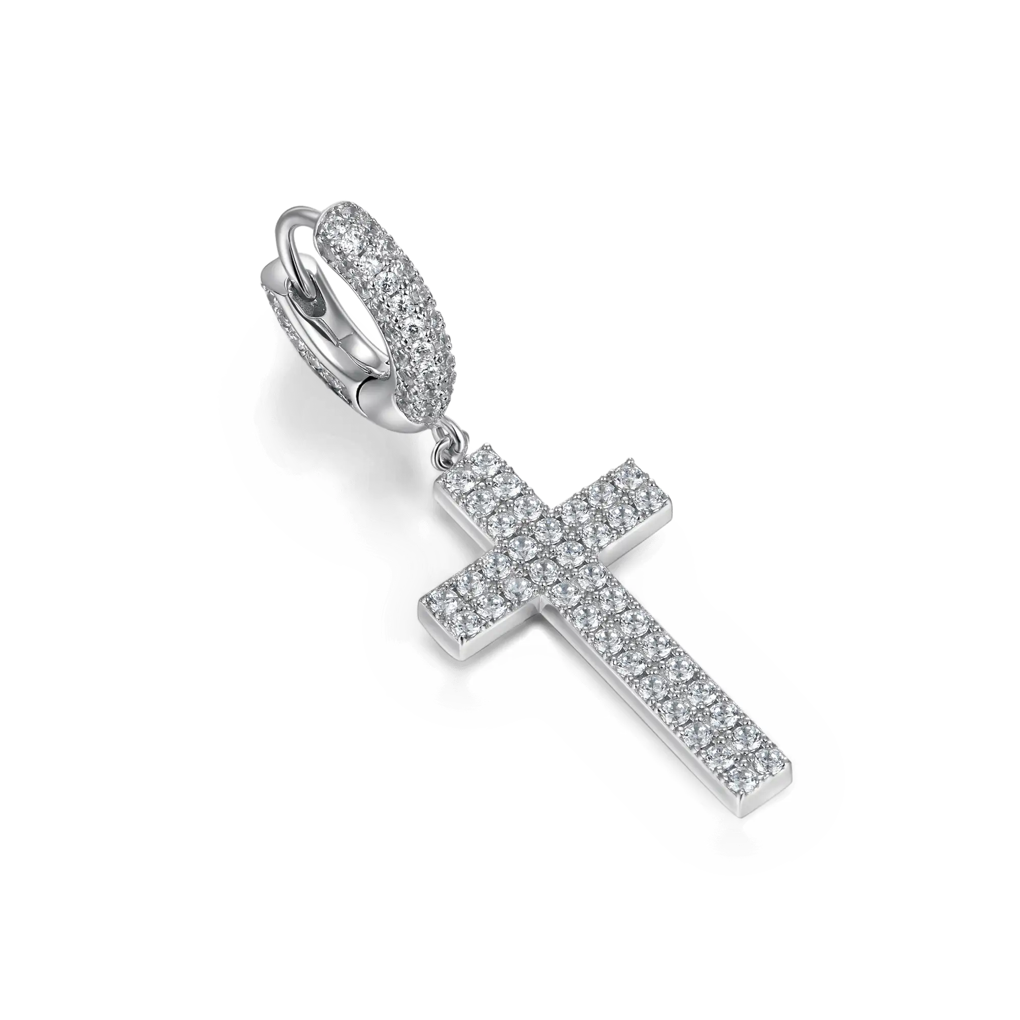 How can you miss the trending fashion of cross-element this summer? The brand new Cross Earrings in 925 Sterling Silver (with Two-Row Gems) are here for you! Made with tension setting, the cross hoop earrings were traced with two rows of round cut CZ stones, which maximizes light return from the top of the stone and adds more sparkles to it. Wrapping snuggly around your earlobes, these chic hoop earrings are comfortable for your everyday wear.