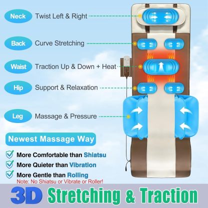 - 【3D Body Stretching & Lumbar Traction】This massage mat for bed comes with 3D full body stretching & traction, plus heating therapy! It can traction up & down, curve stretching, and twist left & right your full body(neck/back/waist/hip/leg). What's more, it can traction your waist, giving you support & relaxation. The back part has an optional heating therapy, which can help you relieve stress, tension, and eliminate fatigue.