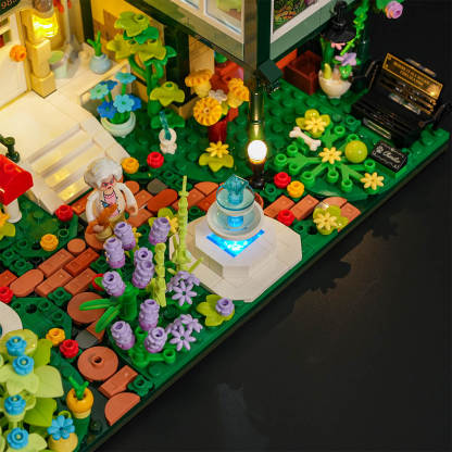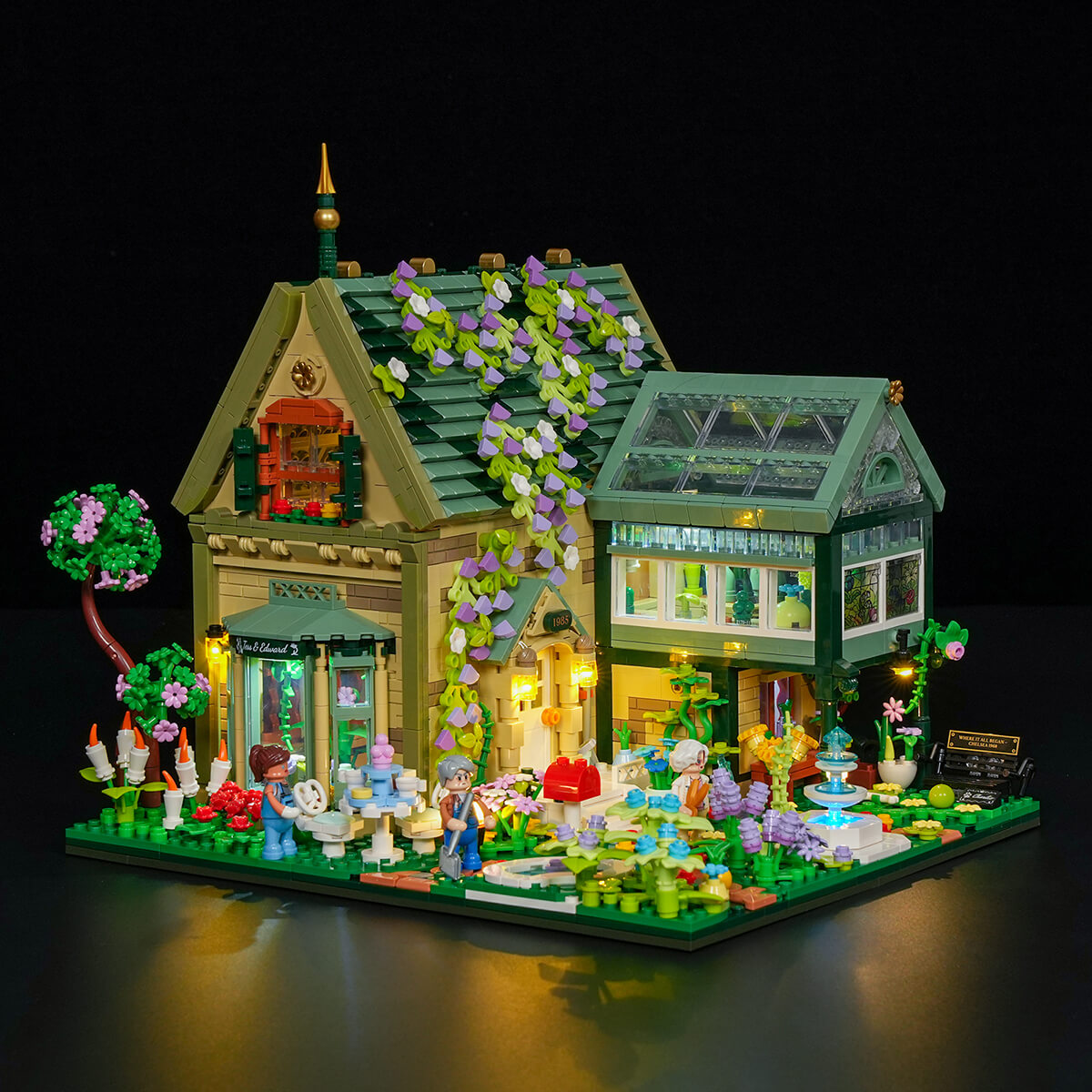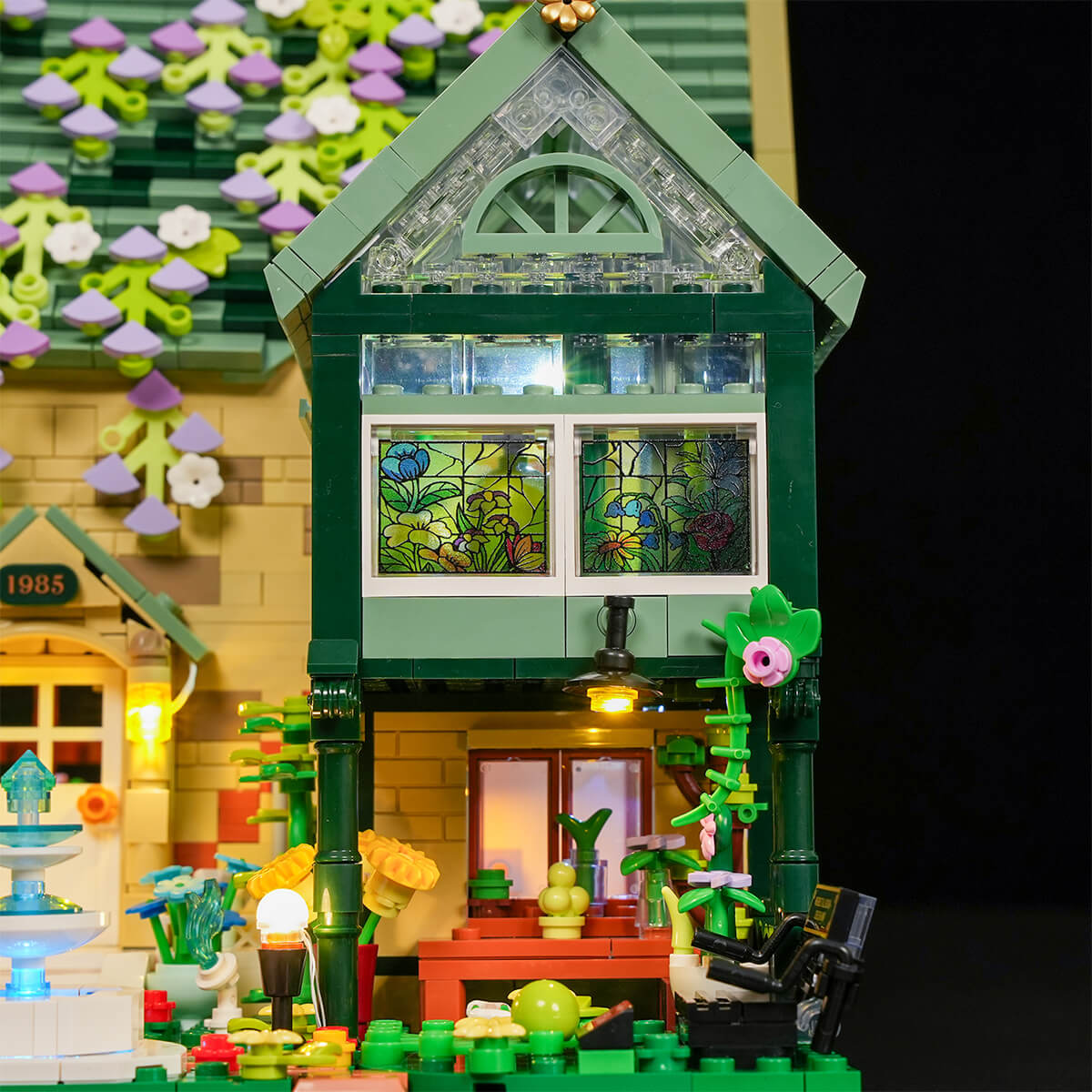 【Light Up a Cozy Night Garden】Warm yellow lights and a blue fountain glow shine through the glass greenhouse, creating soft reflections and a romantic night-garden atmosphere.
