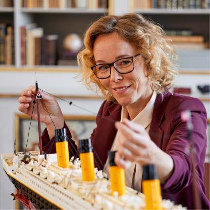 This 1:200 scale model is designed in 3 sections, faithfully recreating the features of the Titanic. The cross section reveals interior details like the first-class dining room, the grand staircases, one of the boiler rooms and many cabins from the different passenger classes. Bring the story of the Titanic to life by recreating details such as the ship’s bridge, promenade deck, reading lounge, swimming pool and many more.