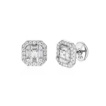 Featuring multi-cut moissanite stones, this halo stud earring is a fusion of timeless style and street culture. It maximizes the brilliance of the diamonds with the cluster design of the small round cut stones circling the main radiant diamond, making it a head-turning masterpiece.