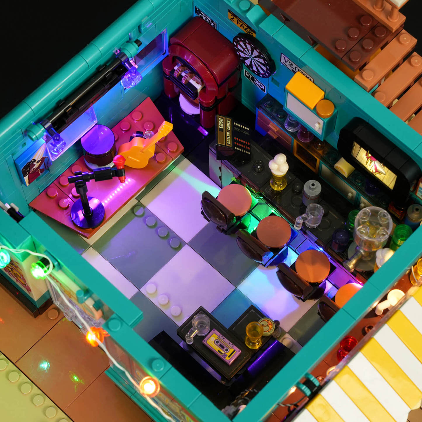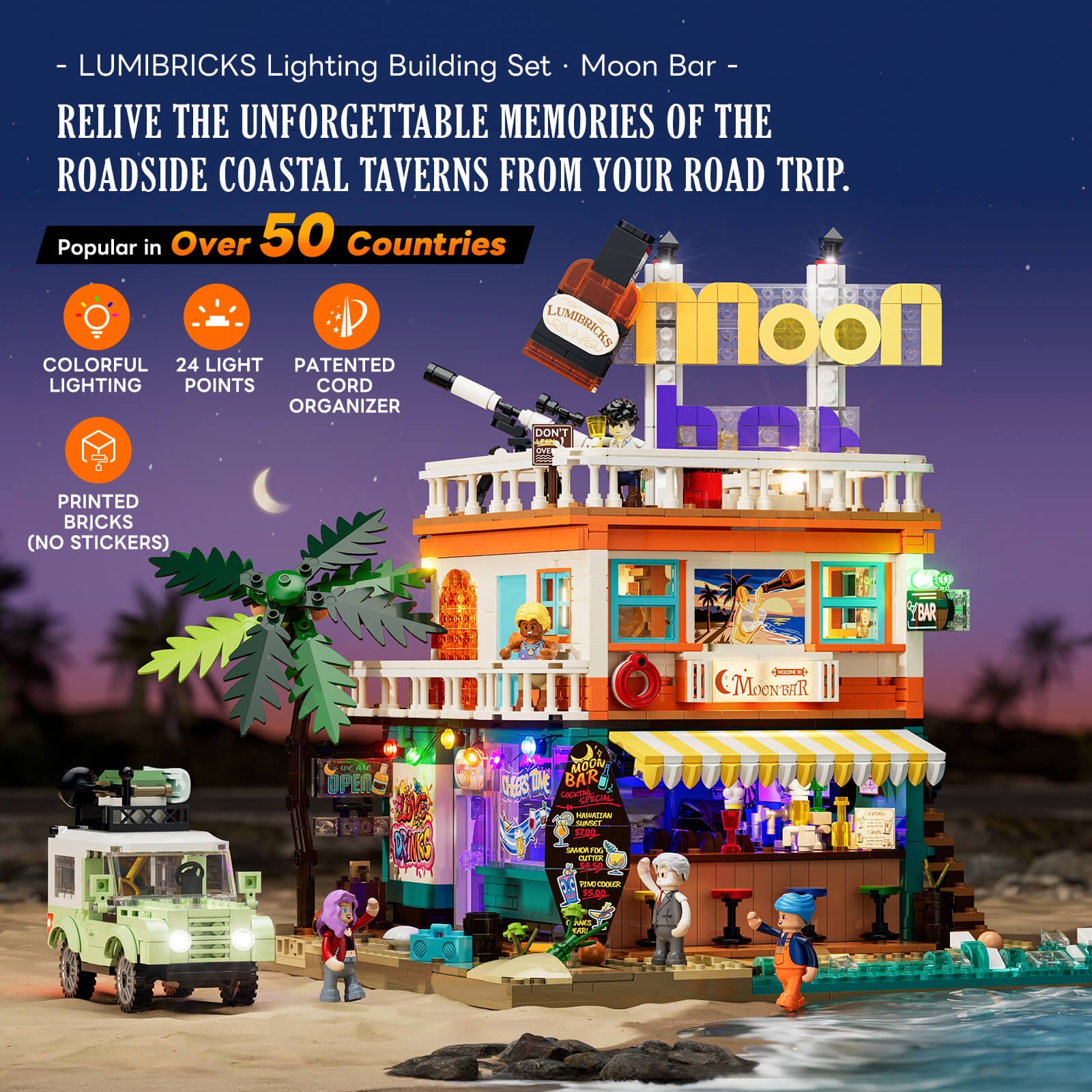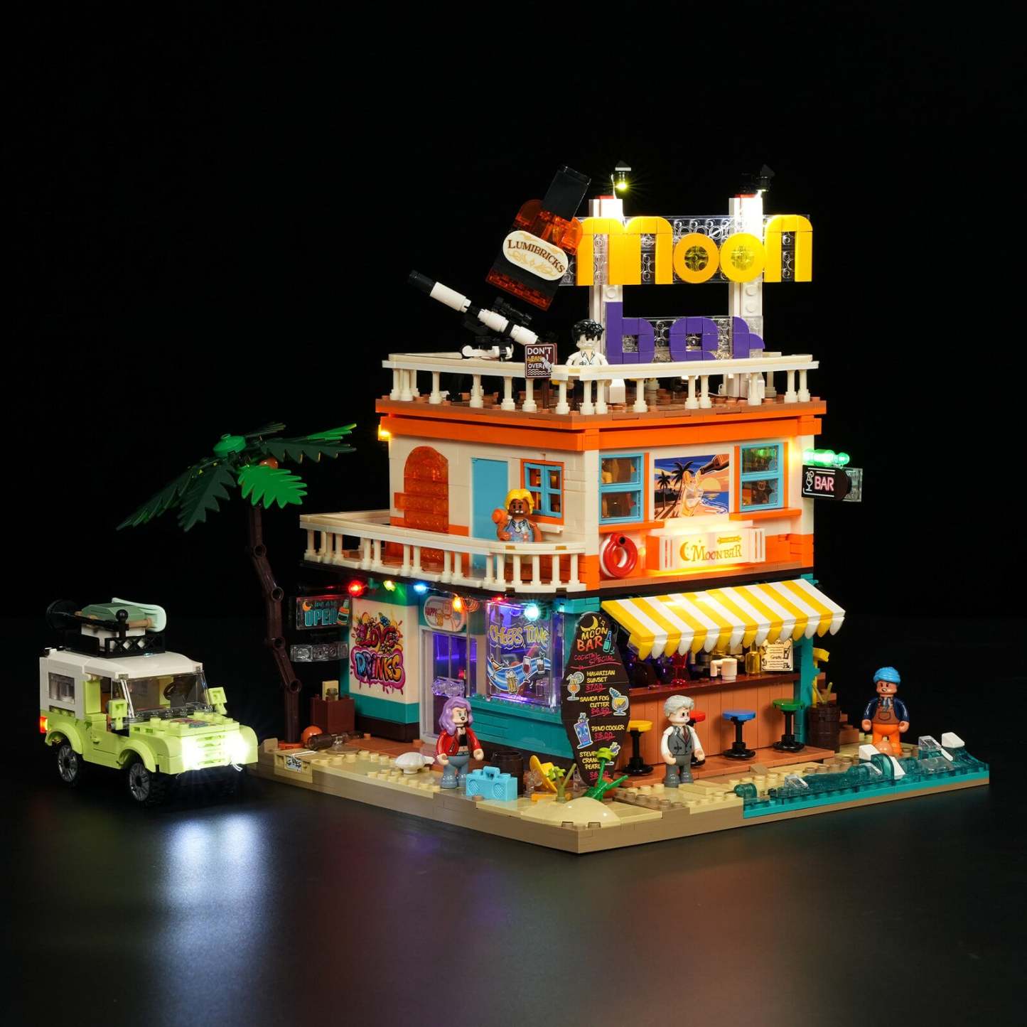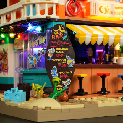 【Rich Retro Printed Details】Packed with printed elements like surfboard menus, music posters, license plates, and a jukebox, the set recreates the nostalgic charm of a 60s–70s American roadside bar from interior to rooftop.