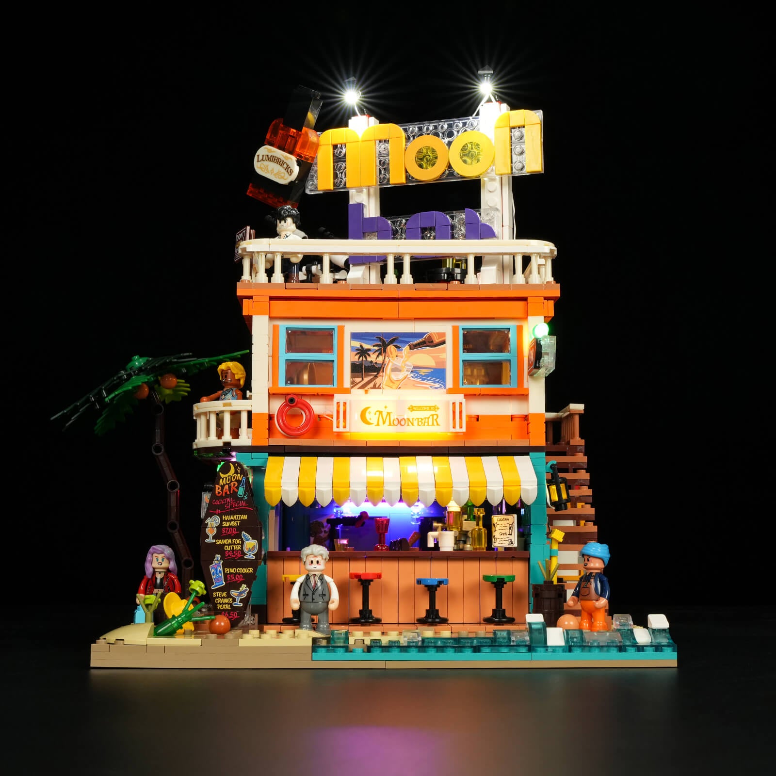 【California Coastal Bar Inspiration】Inspired by bars along the Pacific Coast Highway, featuring a rooftop sign, side neon signage, exterior stairs, and an open-air drinking area to capture the laid-back coastal road trip vibe.
