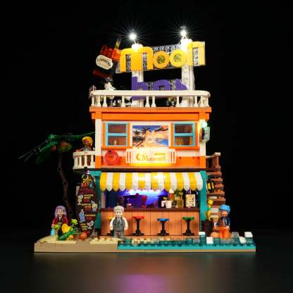 【Vibrant Bar Lighting Atmosphere】Color-shifting string lights and a soft violet stage glow combine with illuminated signs and interior lighting to create a lively yet romantic coastal bar night.