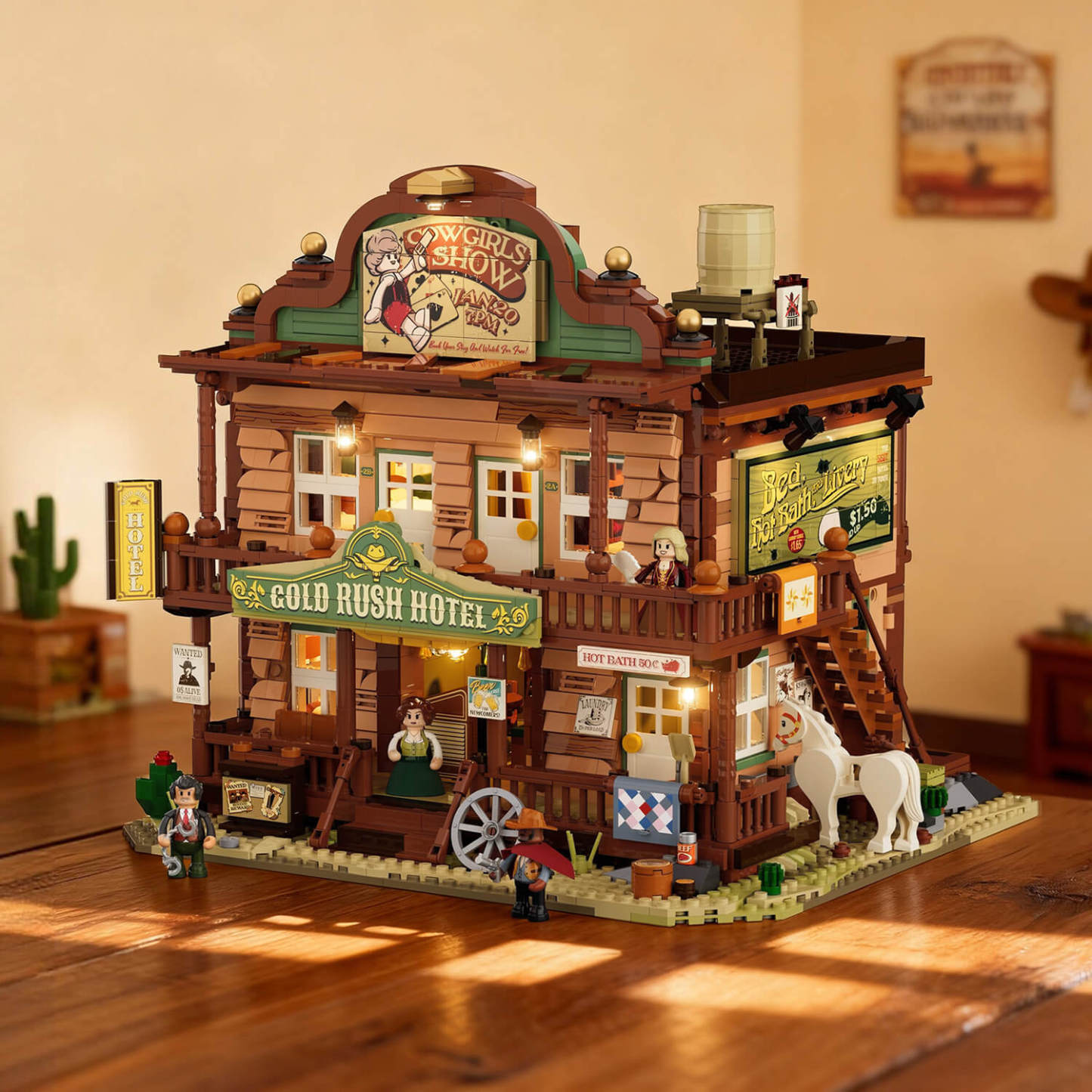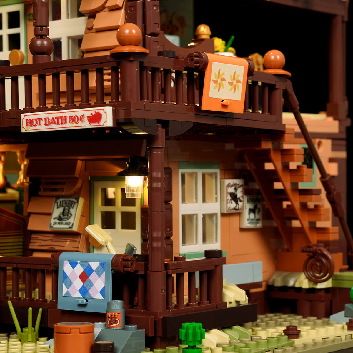 【Immersive Western Nightscape】Thirteen precisely placed light points illuminate the entire western town at night. From the inn's sign to indoor spaces, lighting follows architectural logic to faithfully recreate authentic Old West streetscapes after dusk.