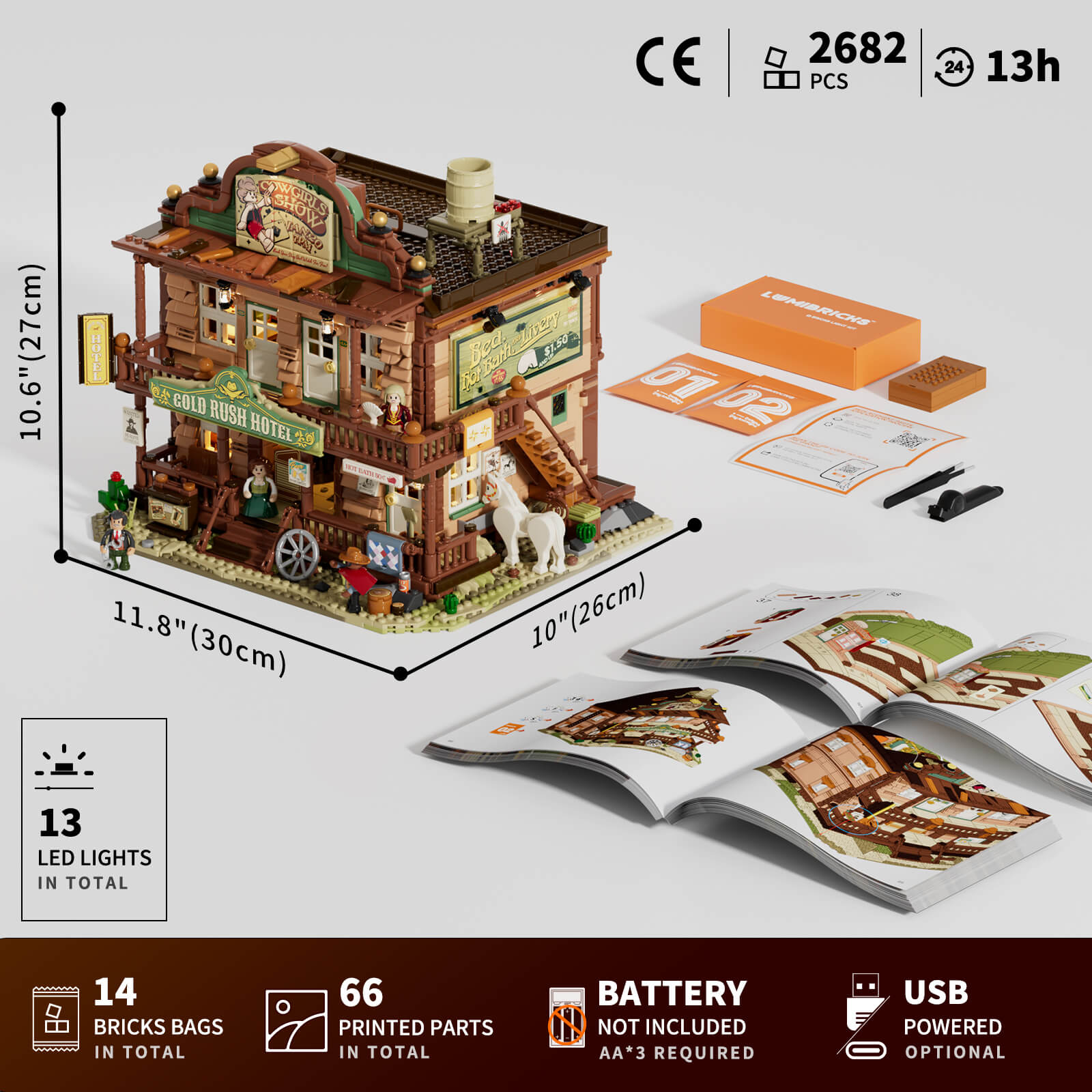 【Package List】The product includes building blocks 2682PCS, 14 bricks bags, 66 printed bricks, 13 LED lights, and 2 detailed assembly guides.