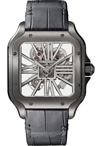 Santos 39.8MM WHSA0009 Skeleton Roman Dial Black Stainless Steel Bezel Black Leather Strap
