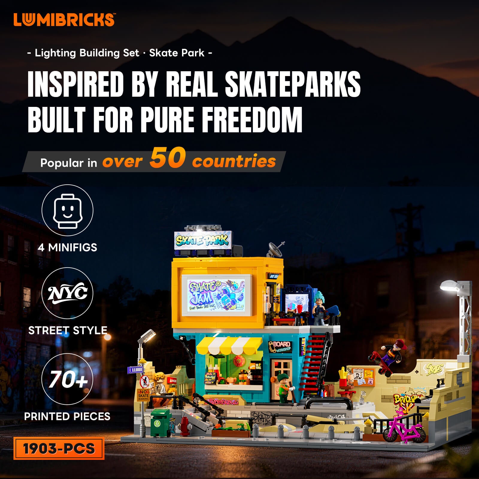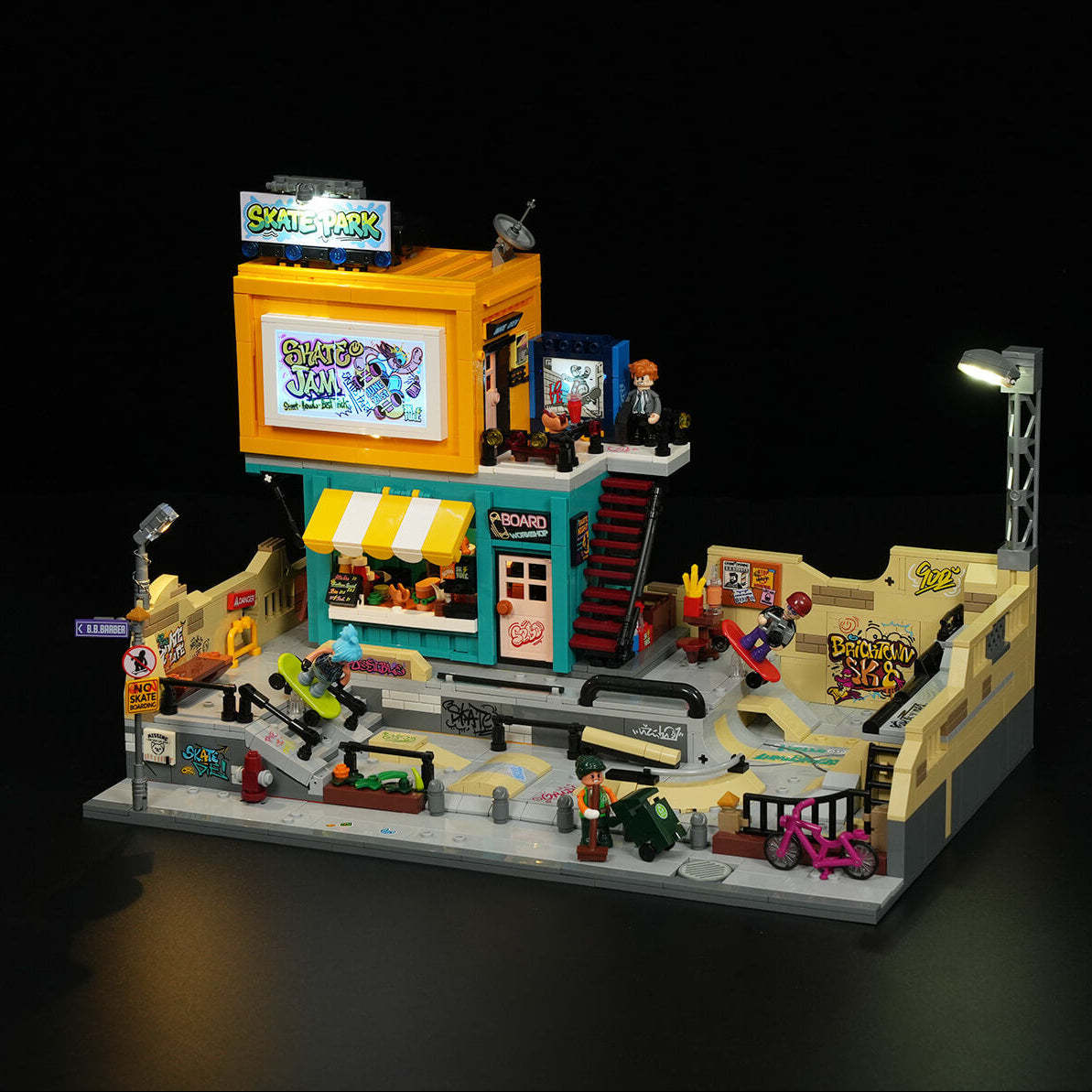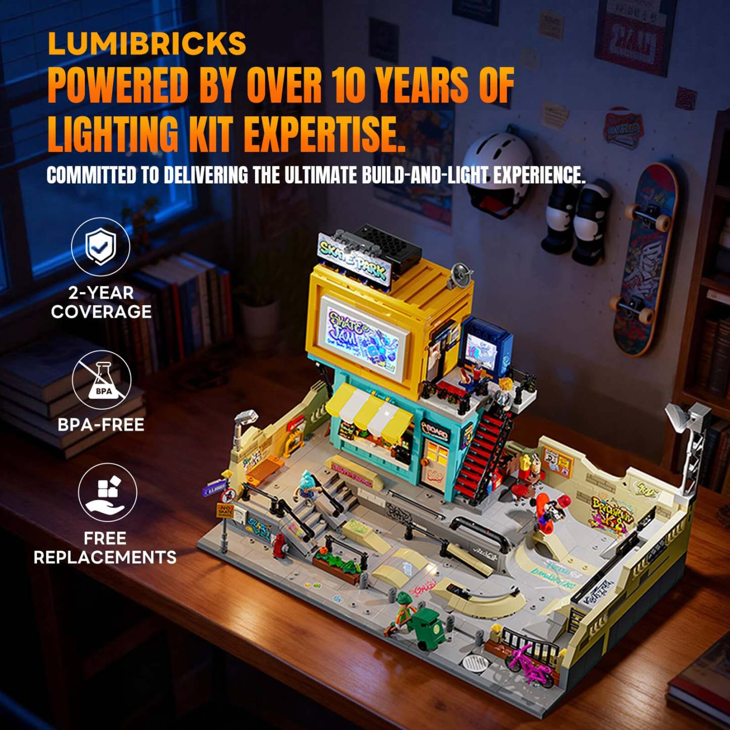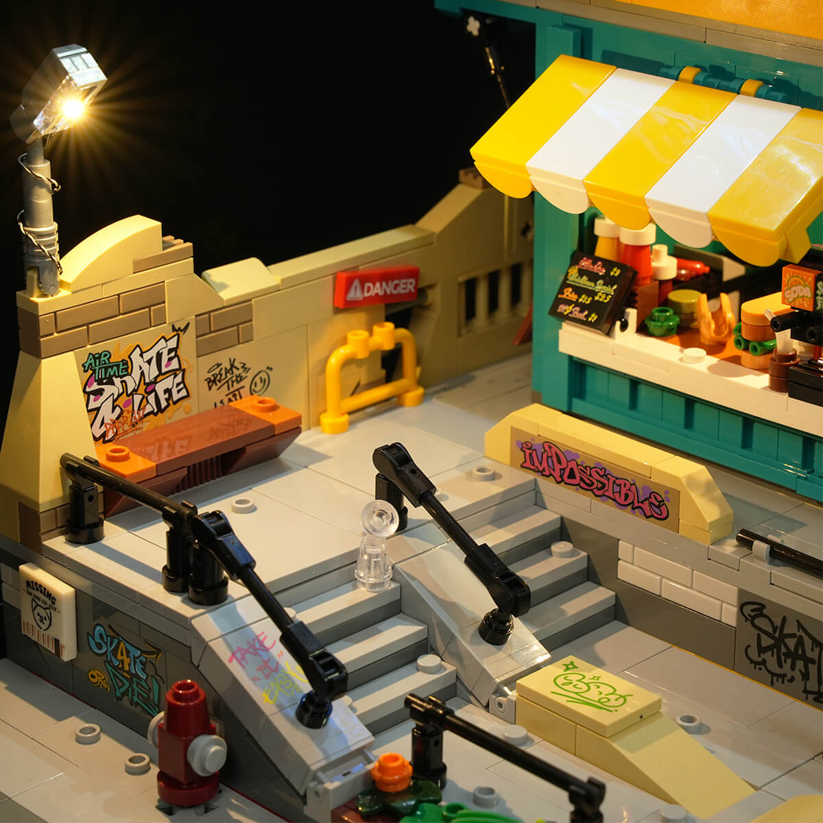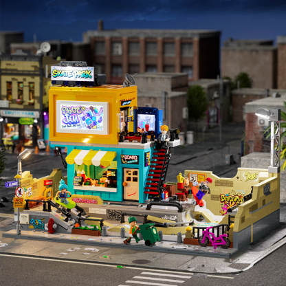 【Light-Up Open Skatepark Layout】Featuring 7 lighting points and 3 light strings with dual battery boxes and USB power, the set recreates the vibrant glow of a night skatepark.
