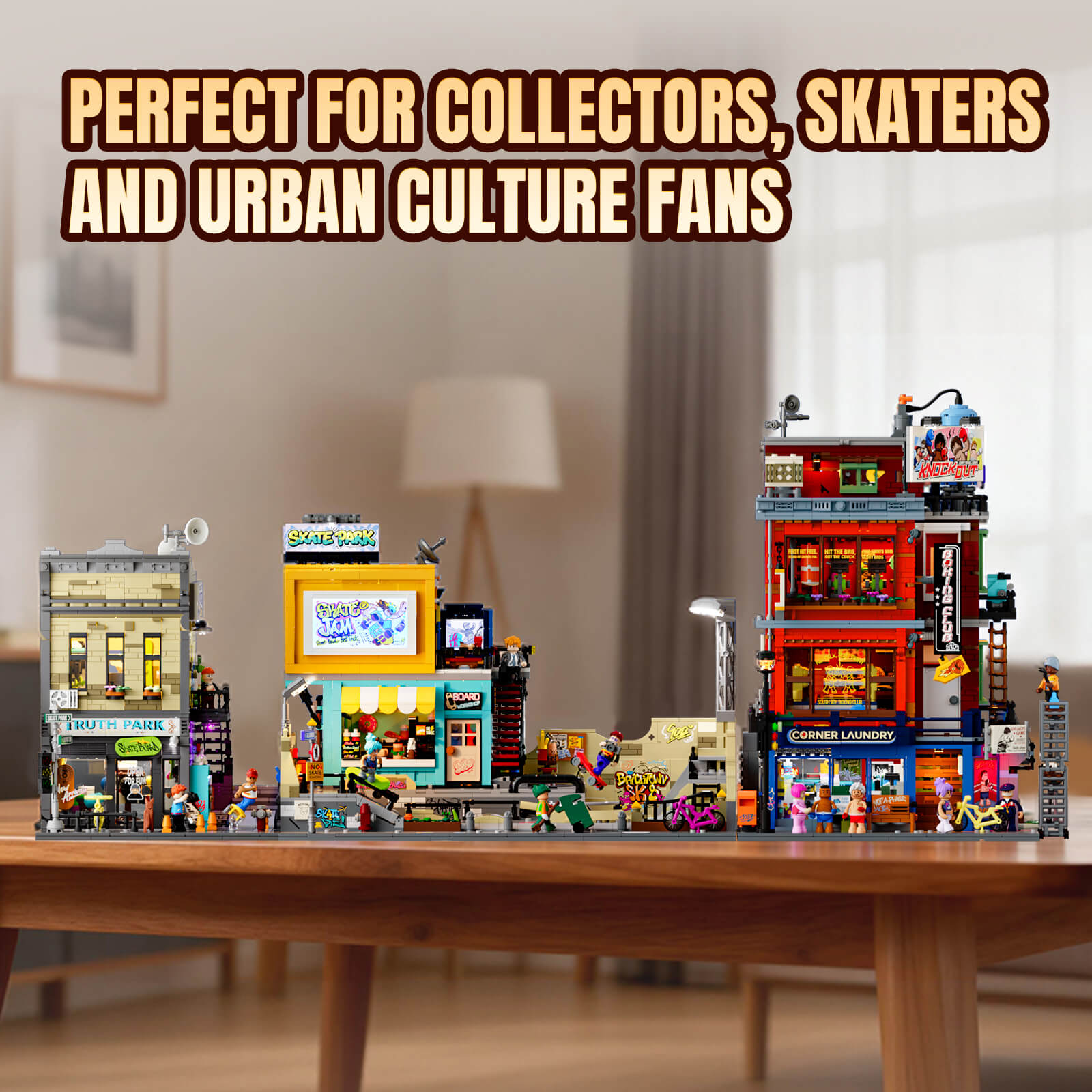 【Street Series Easter Eggs】Hidden connections to the street series appear throughout the set—featuring the Skate OG minifigure, a barbershop opening notice, graffiti crew logos, and a missing-cat storyline that hints at future sets.