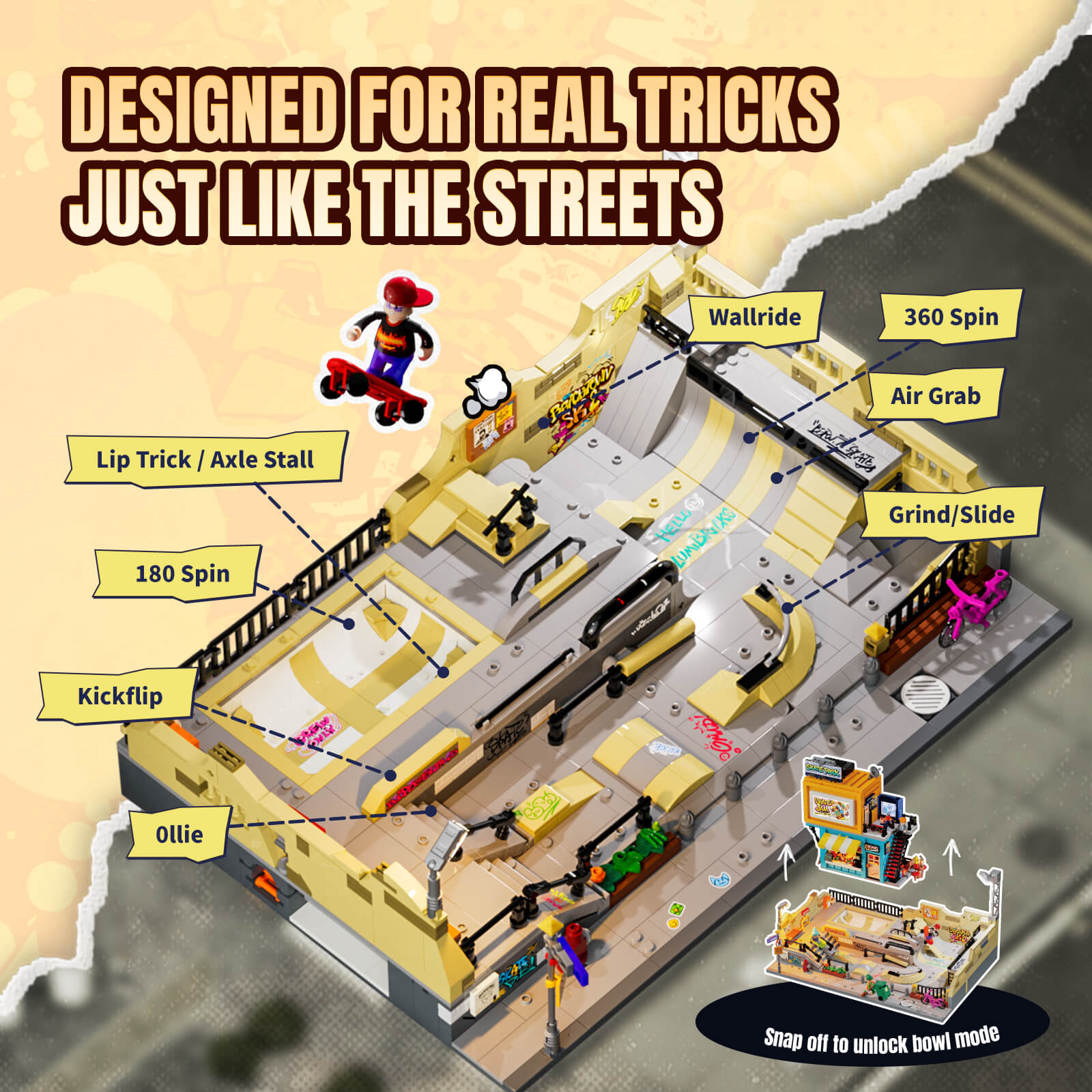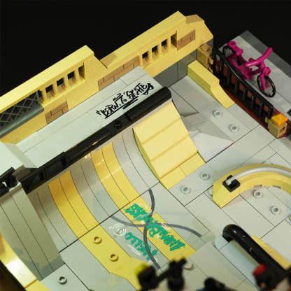 【Immersive Skate Culture Experience】Featuring a halfpipe, stairs, ramps, and rails inspired by real skateparks, the set recreates an authentic street skating layout for dynamic display and interaction. The removable container reveals a hidden bowl, adding surprise and dynamic display possibilities.
