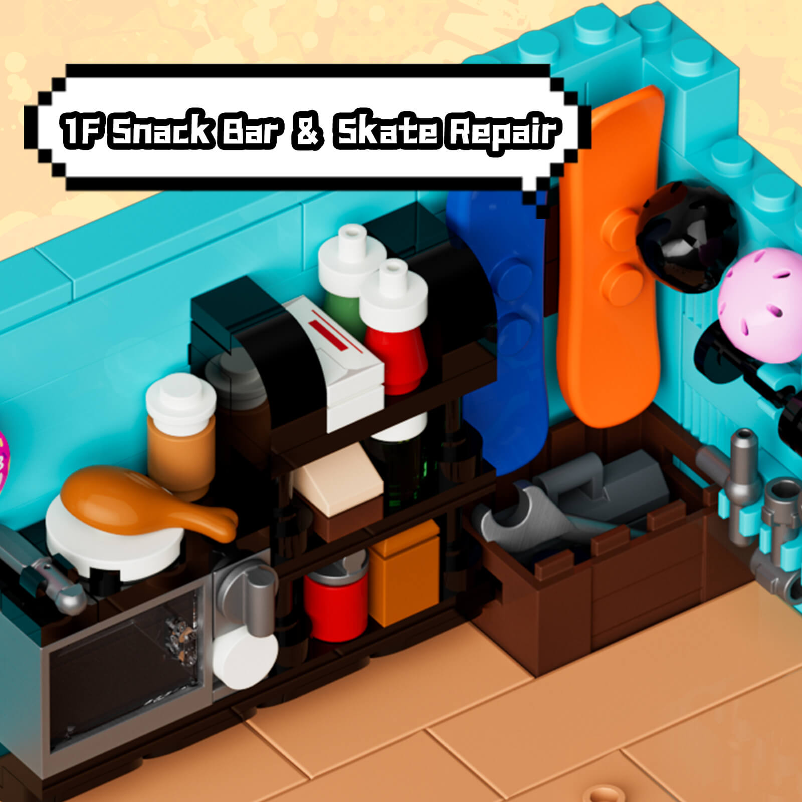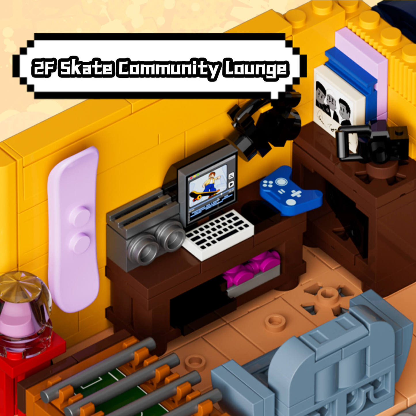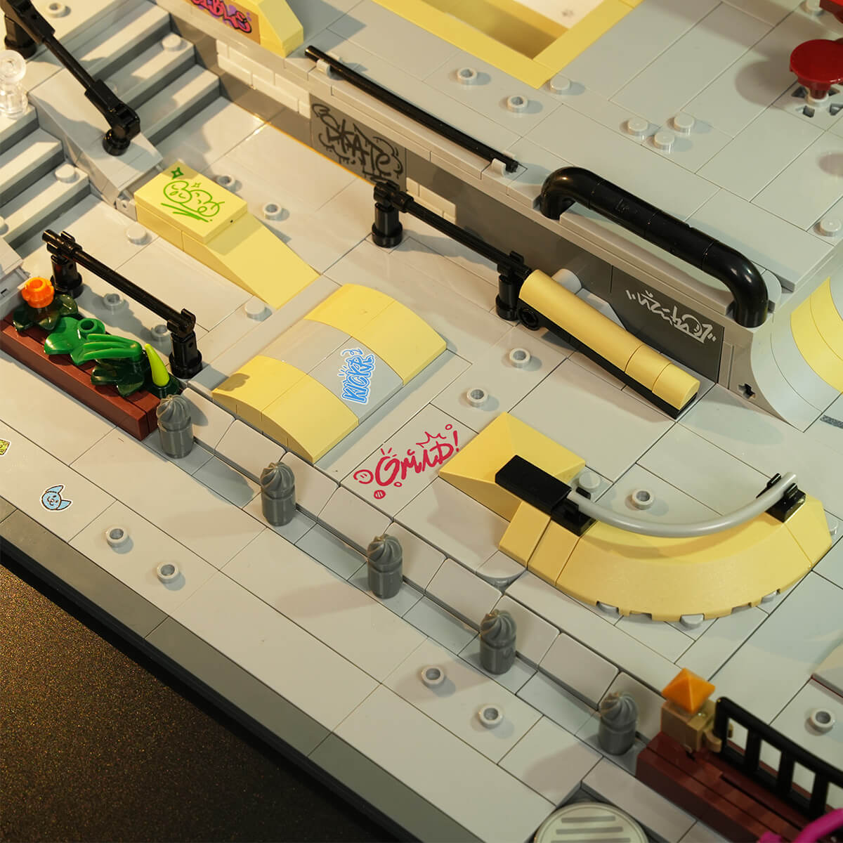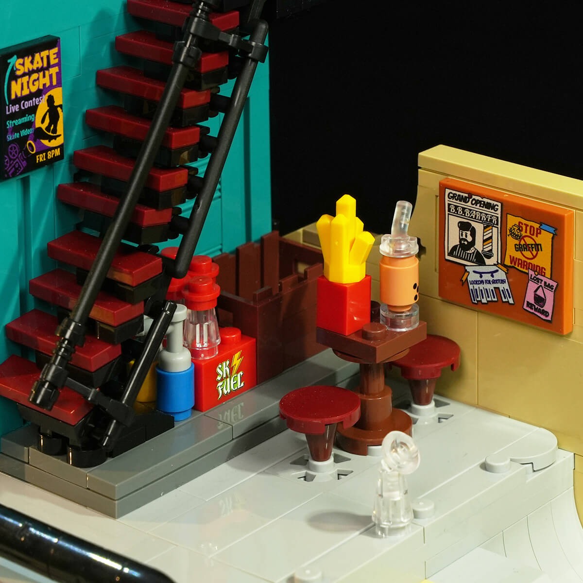 【A Hub for Skate Community】Inside the container are a community lounge, street snack stand, and screening corner, recreating the gathering space of skate culture. Minifigures and graffiti details pay tribute to authentic skate communities.