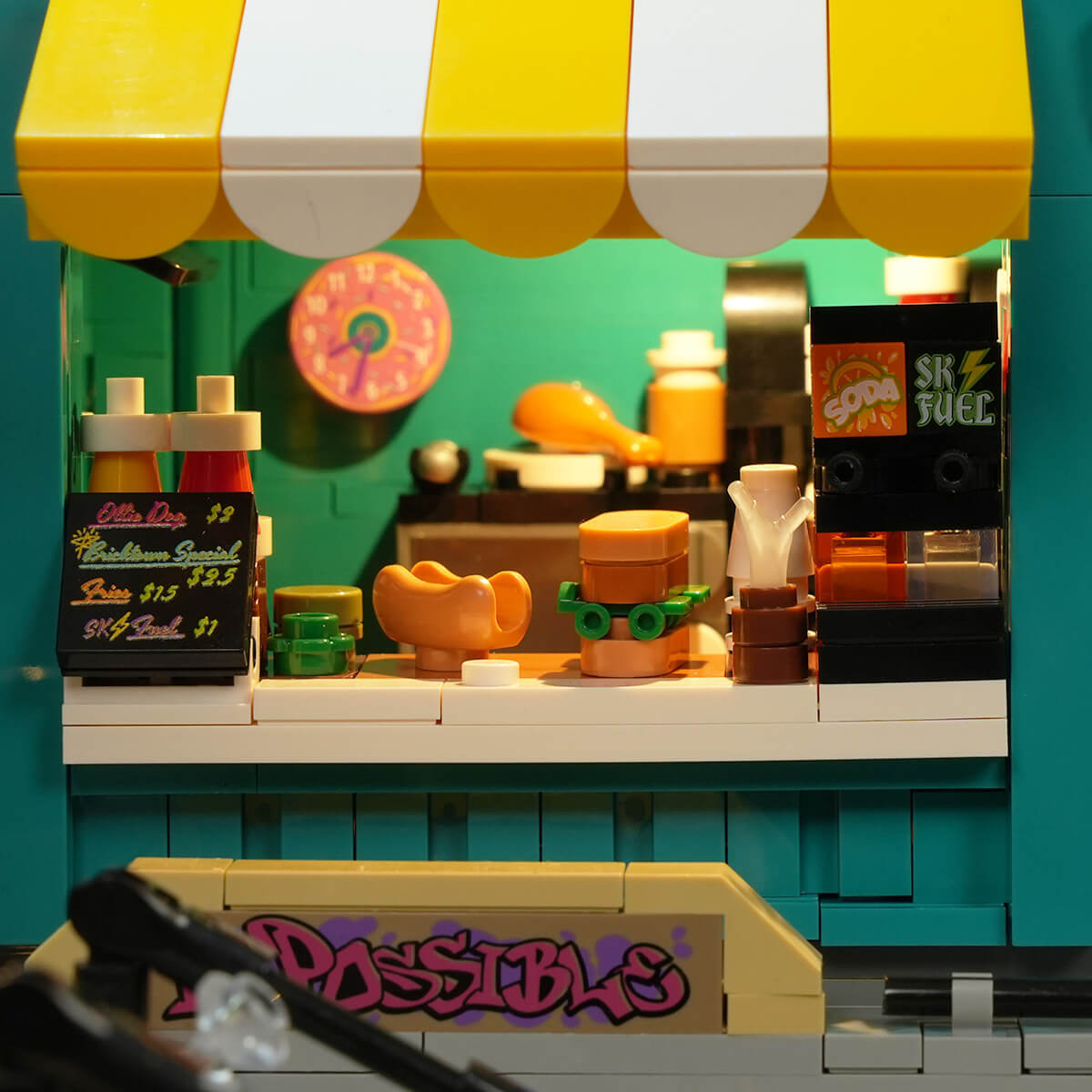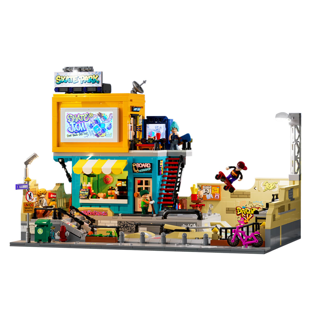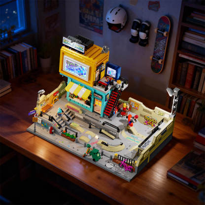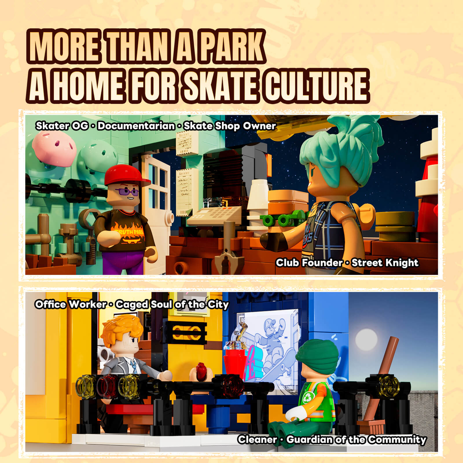 【A Hub for Skate Community】Inside the container are a community lounge, street snack stand, and screening corner, recreating the gathering space of skate culture. Minifigures and graffiti details pay tribute to authentic skate communities.