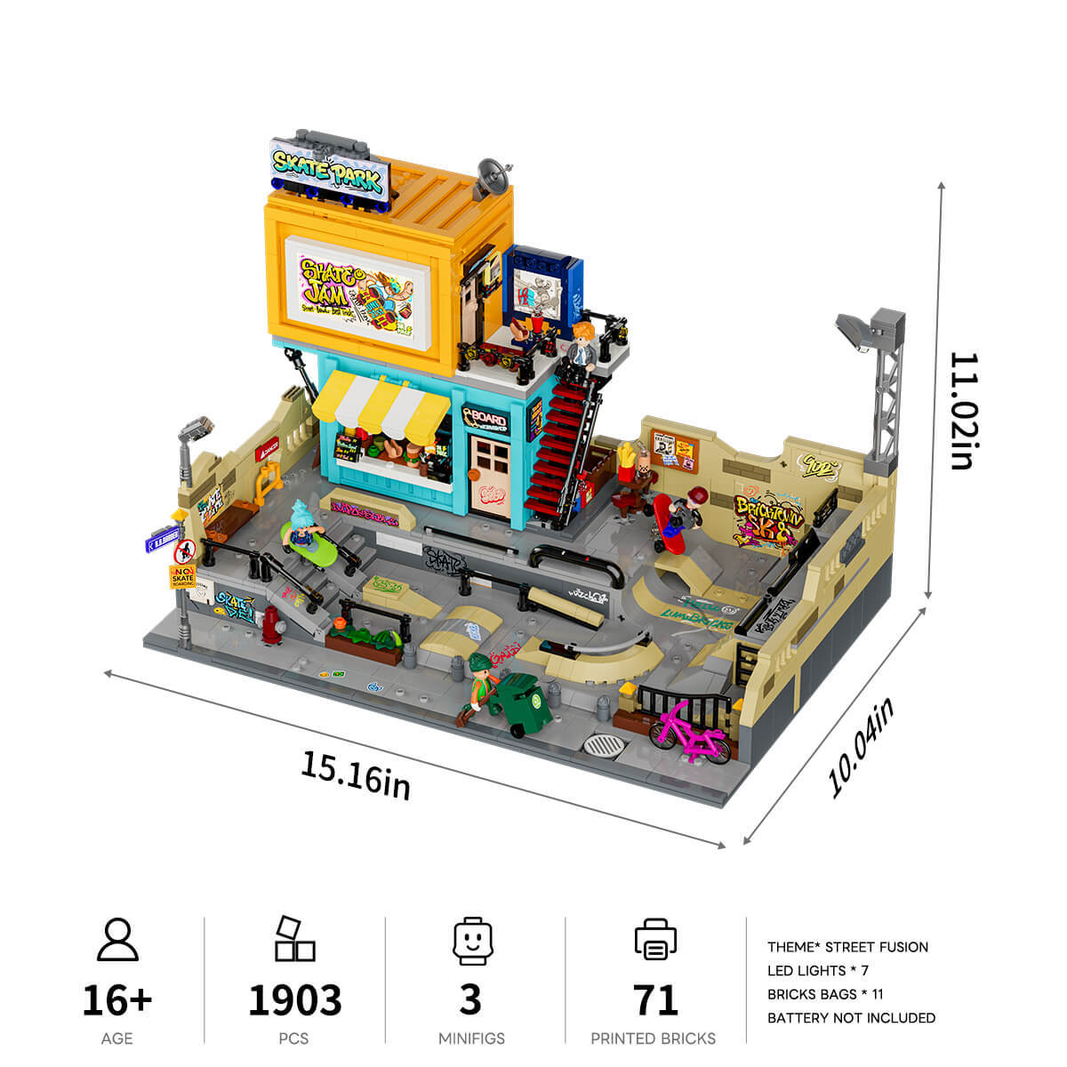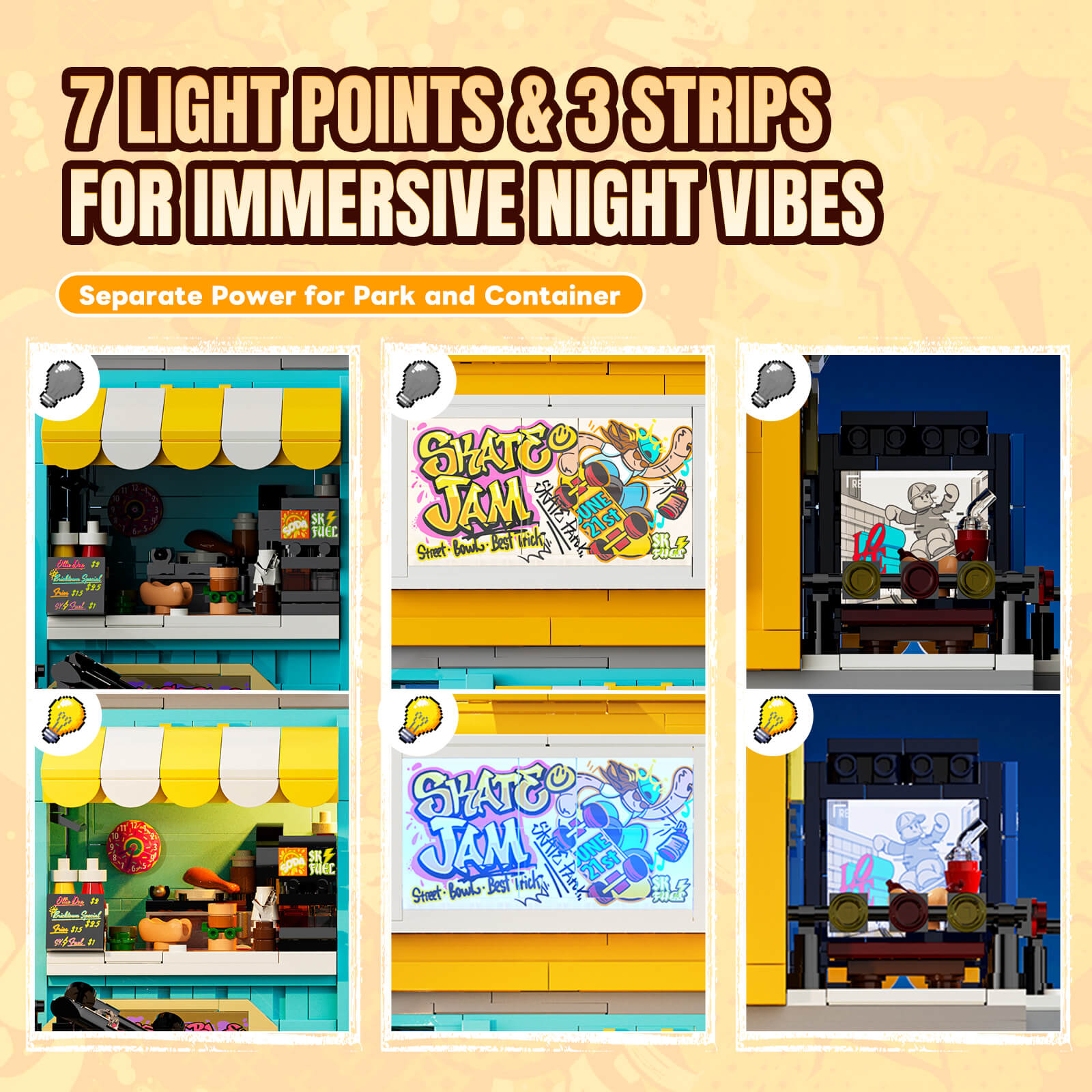 【Authentic Street Skatepark Vibes】Inspired by real skateparks, graffiti walls, container structures, and spotlights with neon signs recreate a vibrant street skating atmosphere full of urban energy.