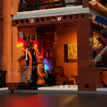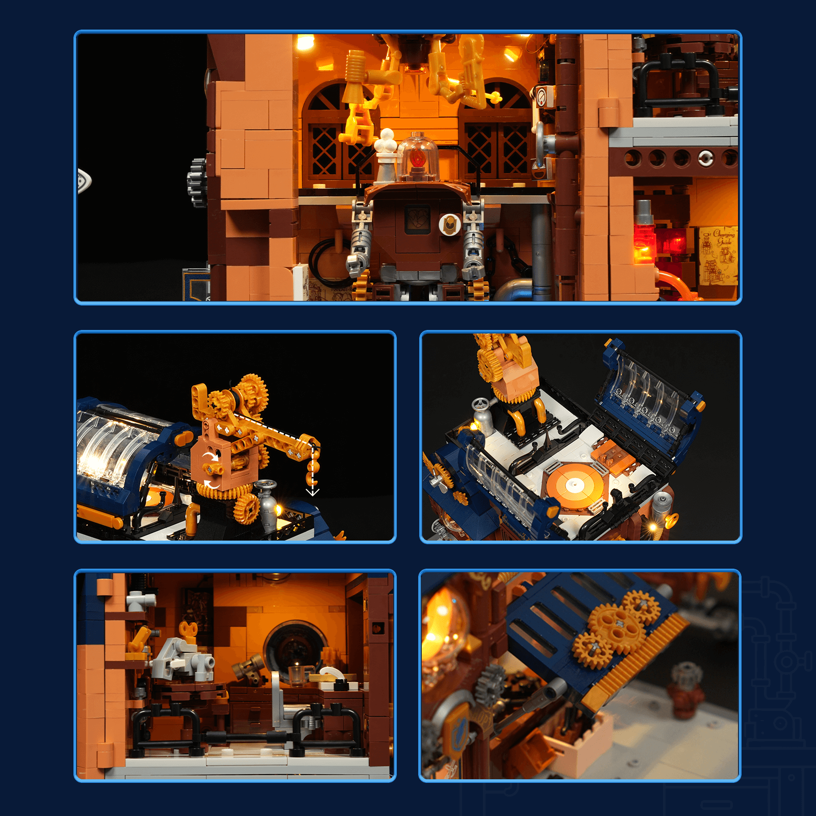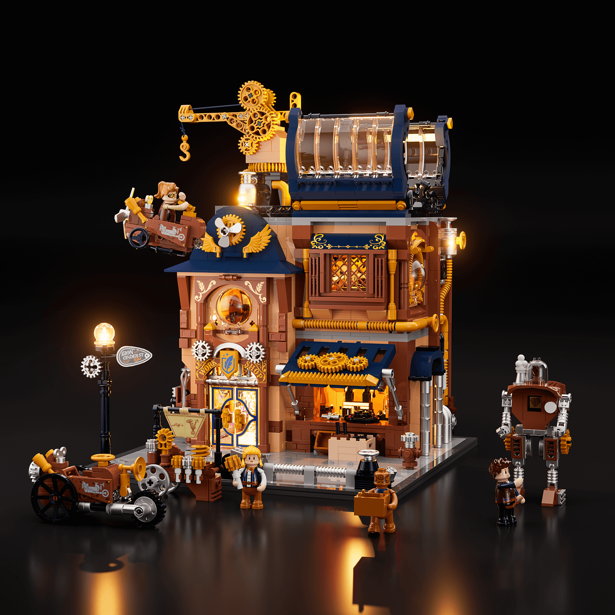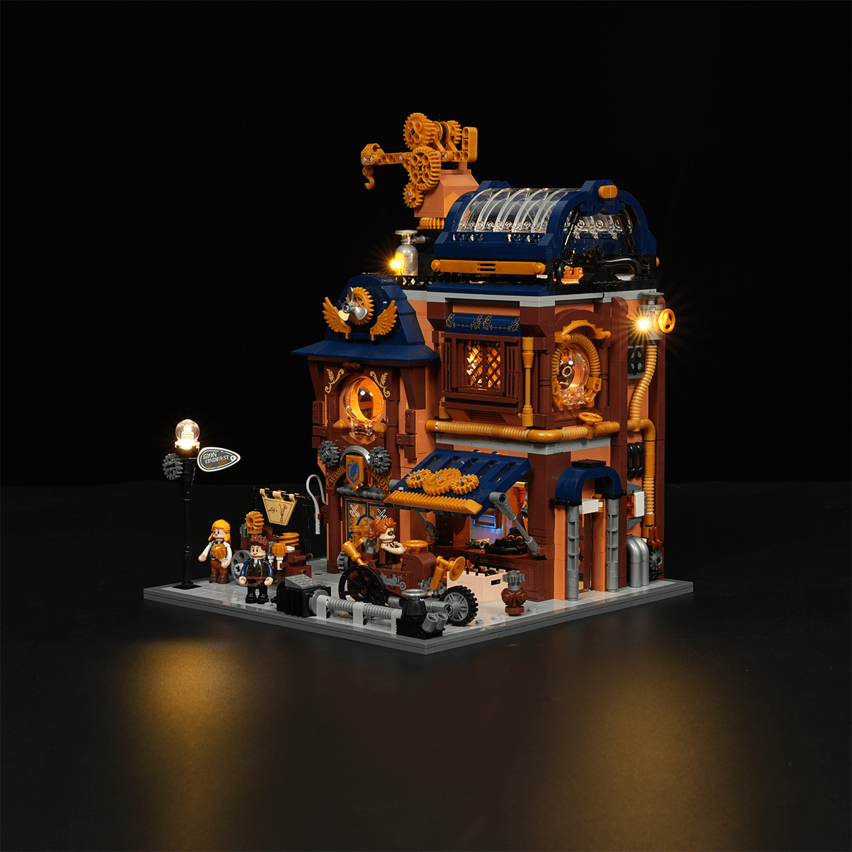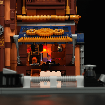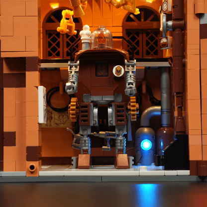 【Immersive Mechanical Light Experience】Building upon steampunk-inspired retro lighting, this interactive display features dynamic effects triggered by model assembly and minifigure interactions.