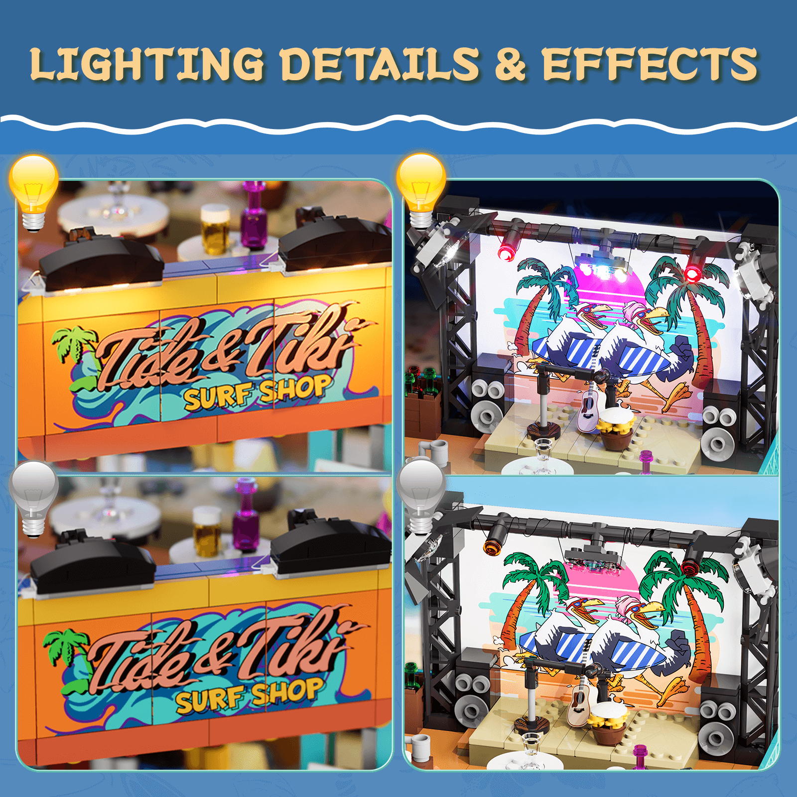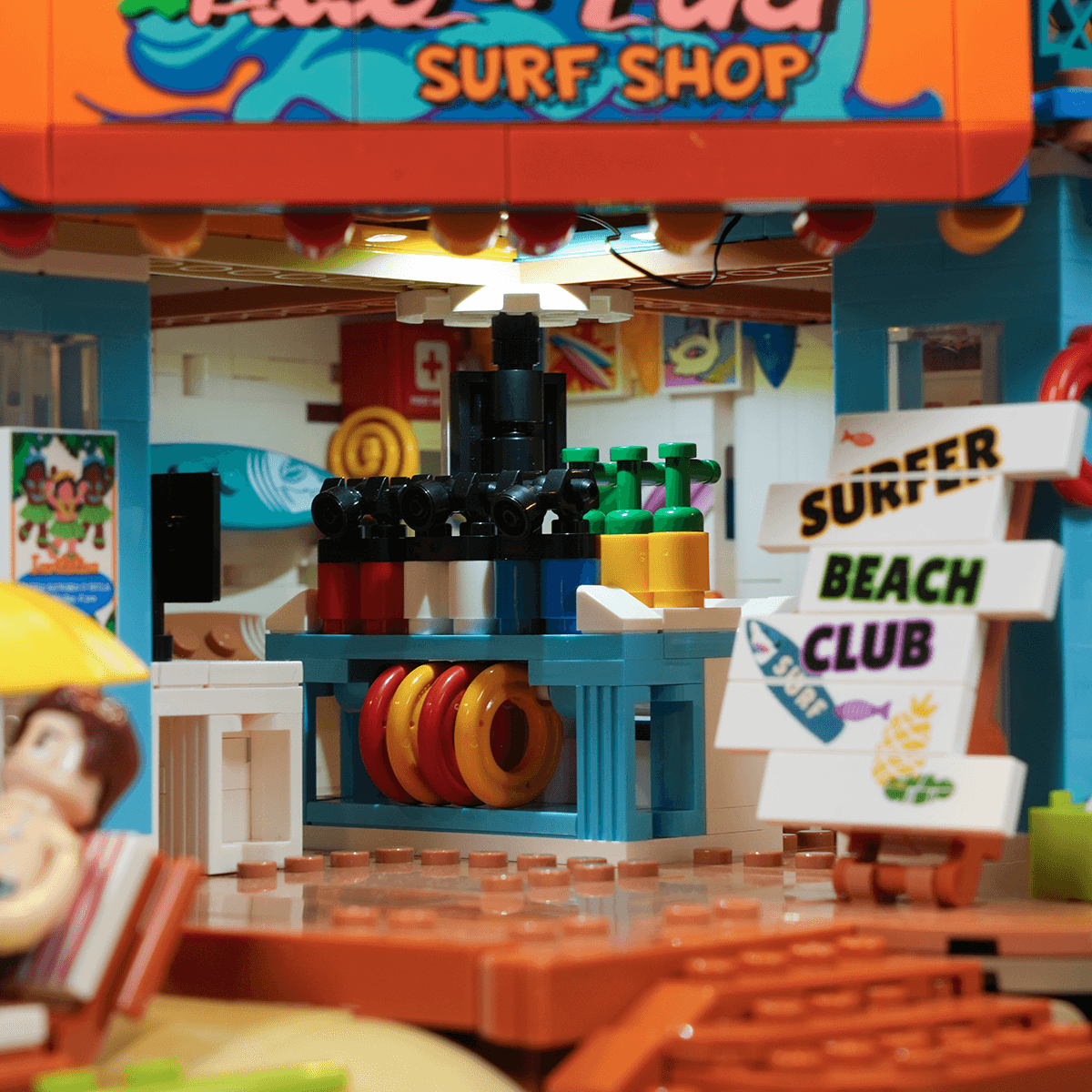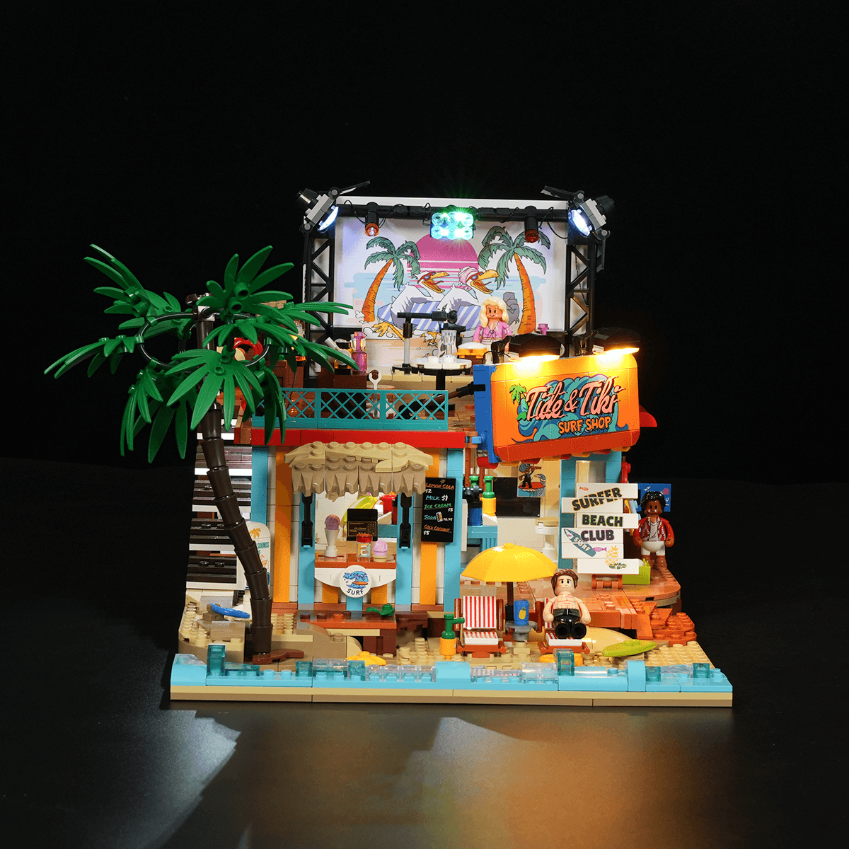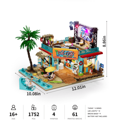 【Authentically Recreates Seaside Resort Life】Tropical architecture featuring vibrant colors and palm tree elements perfectly captures the essence of a beach surf shop.