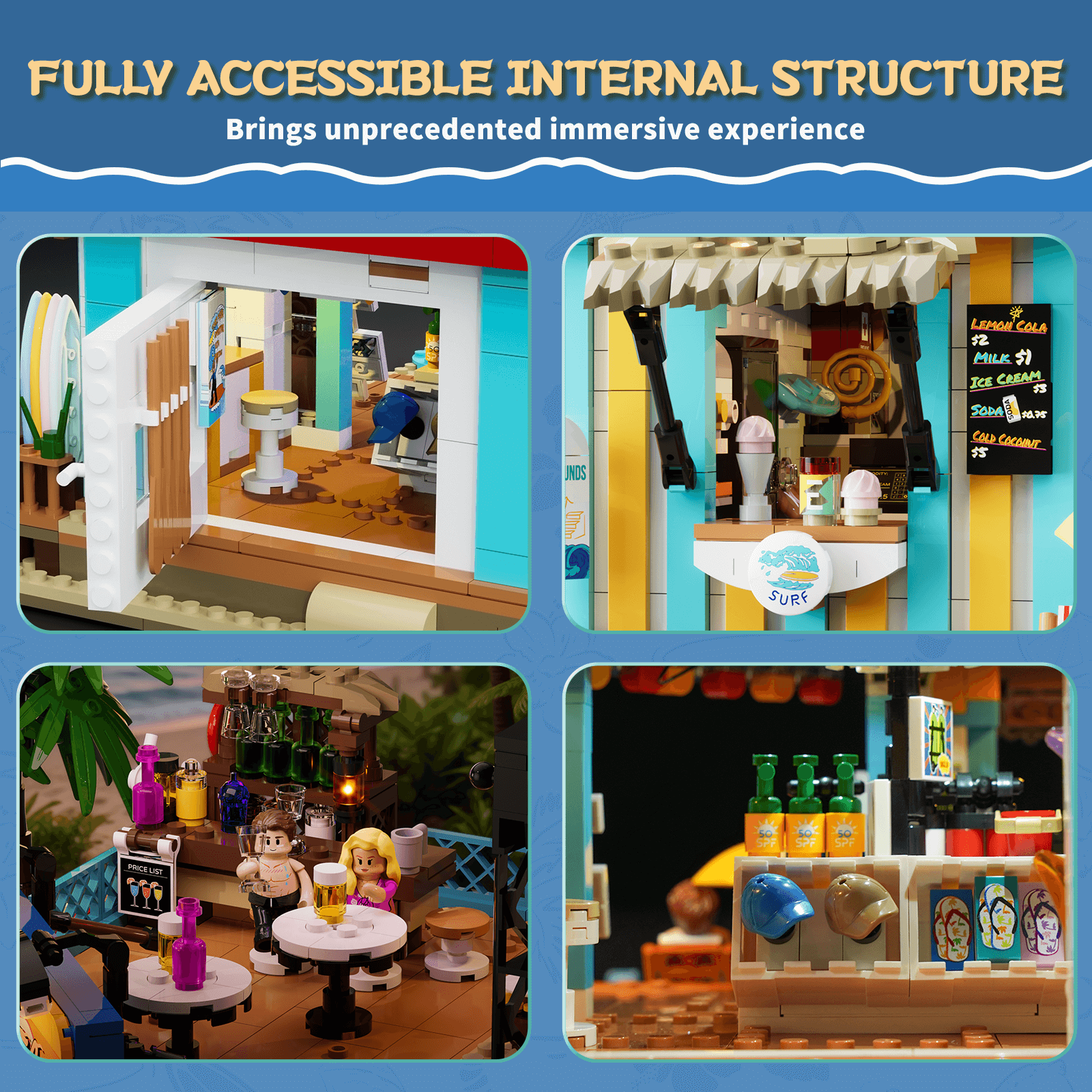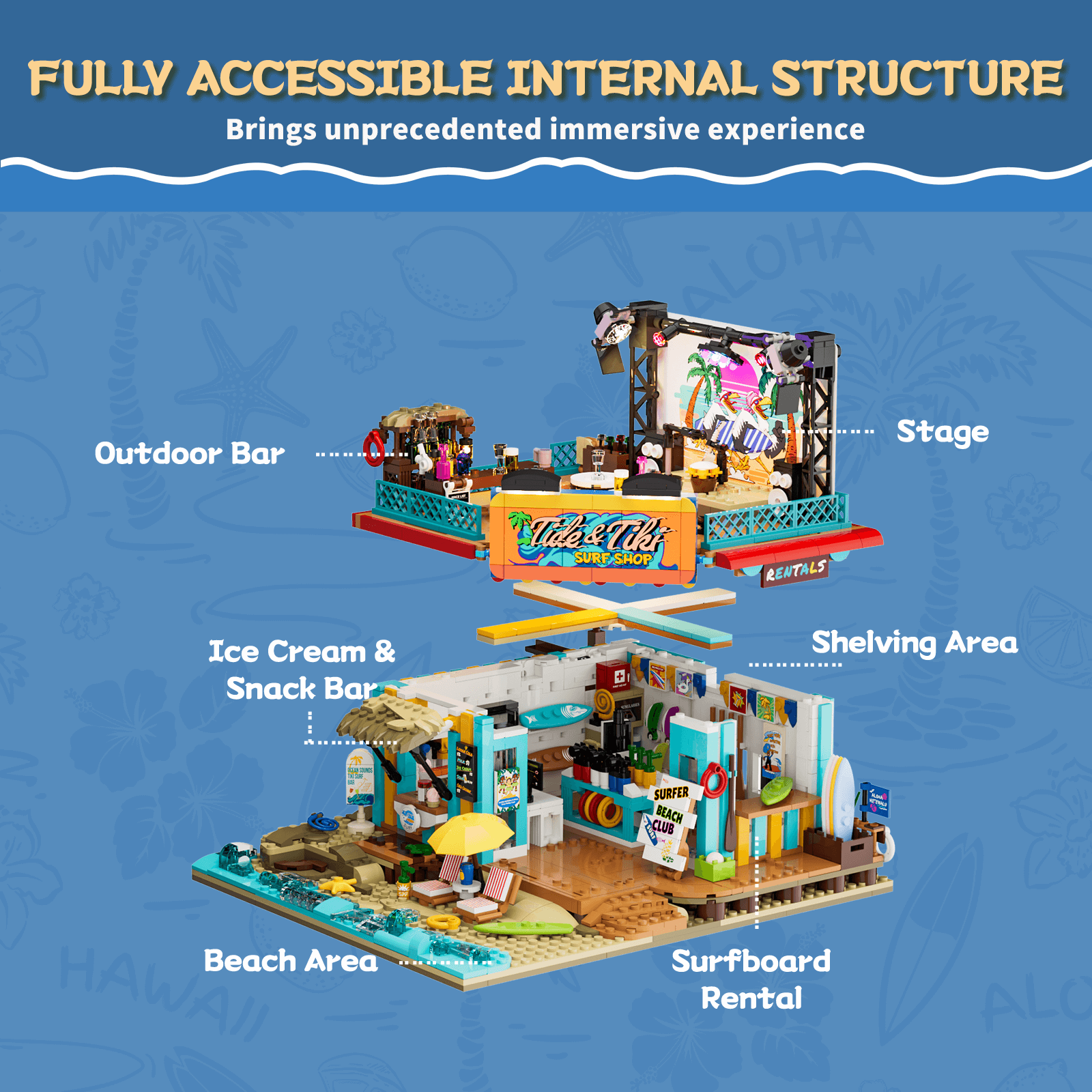 【Multiple Quick-Release Features, Panoramic Interaction】Removable roof, railings, and second-floor stage reveal interior details. The first floor has a back-opening design. Standalone surfboard module can be displayed independently as an interactive scene.