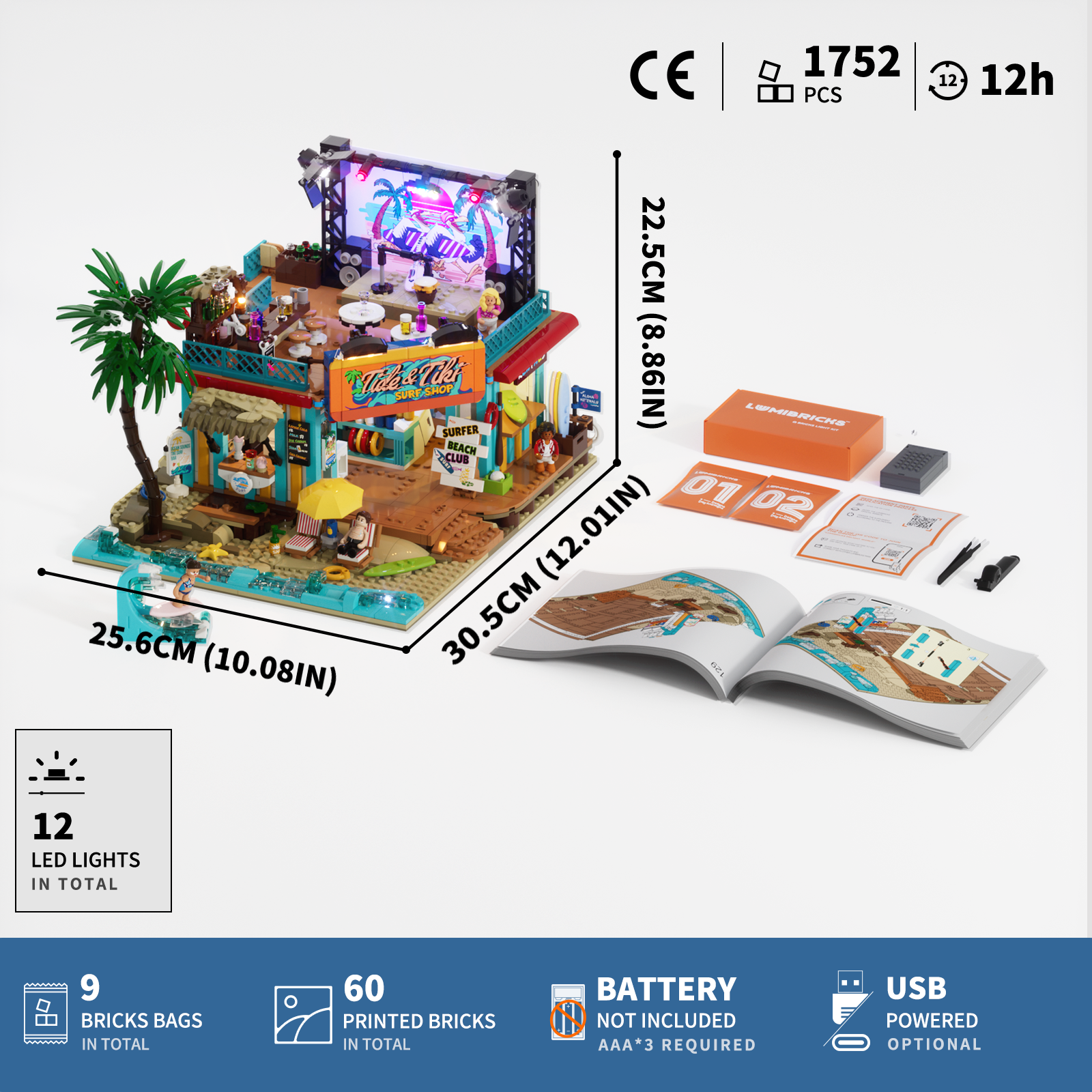 【Package List】The product includes building blocks 1752PCS, 9 bricks bags, 12 LED lights, 60 printed bricks and a clear assembly guide