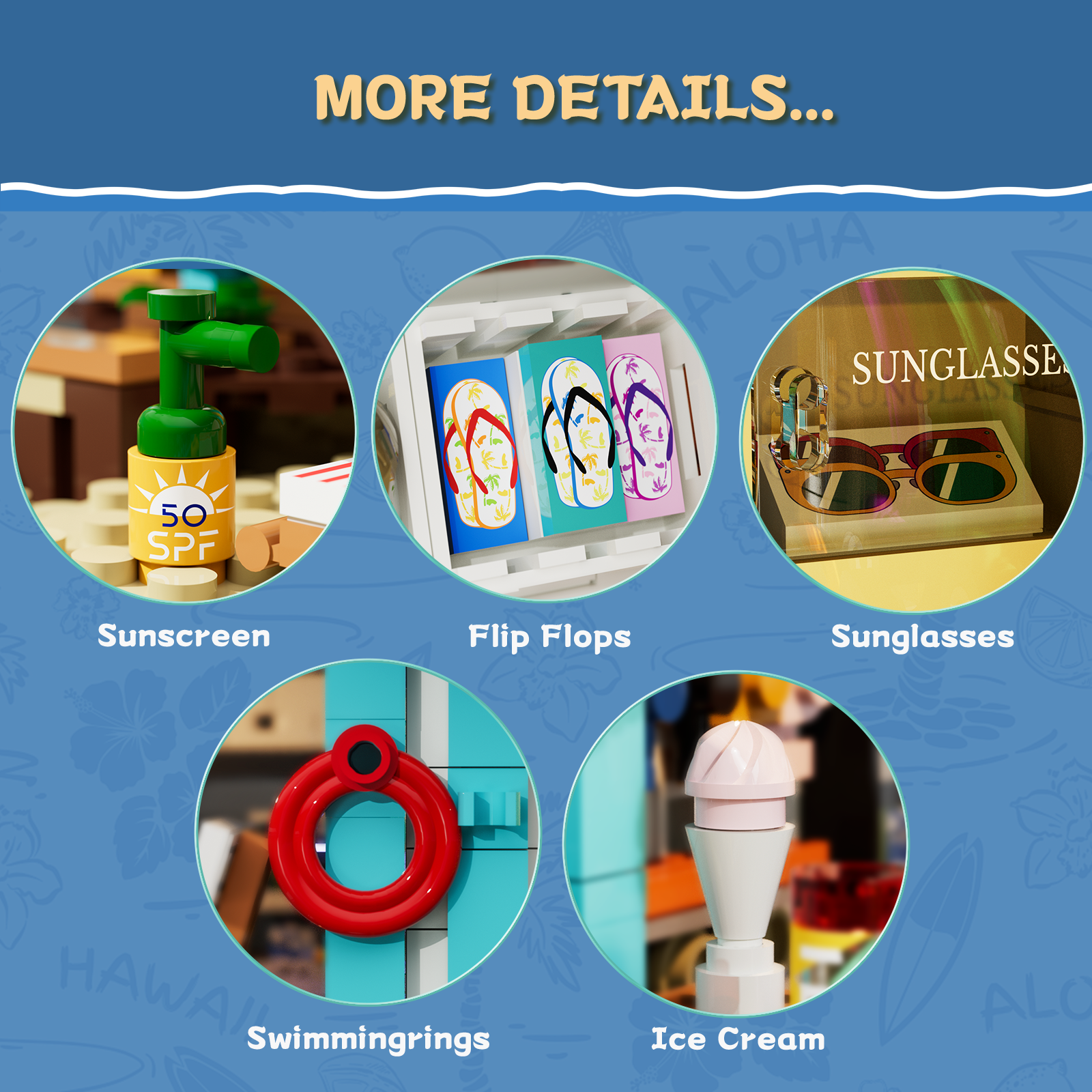 【Exquisite Appearance and Rich Details】Multiple accessory options, including surfboard, juice bottle, beach towel, lounge chair, etc., enhance playability. Original retro-chic back panel design highlights individuality and originality.