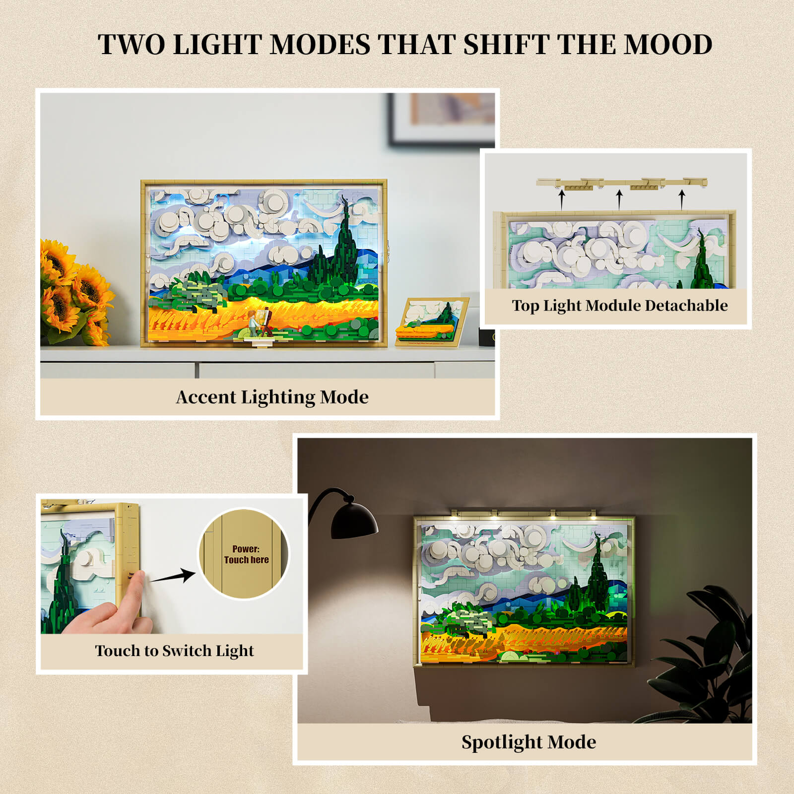 【Dual Lighting Modes, Effortless Control】Integrated lighting enhances the artwork’s atmosphere. Easily switch between ambient lighting and top spotlight mode, and turn the lights on or off with a simple side touch.